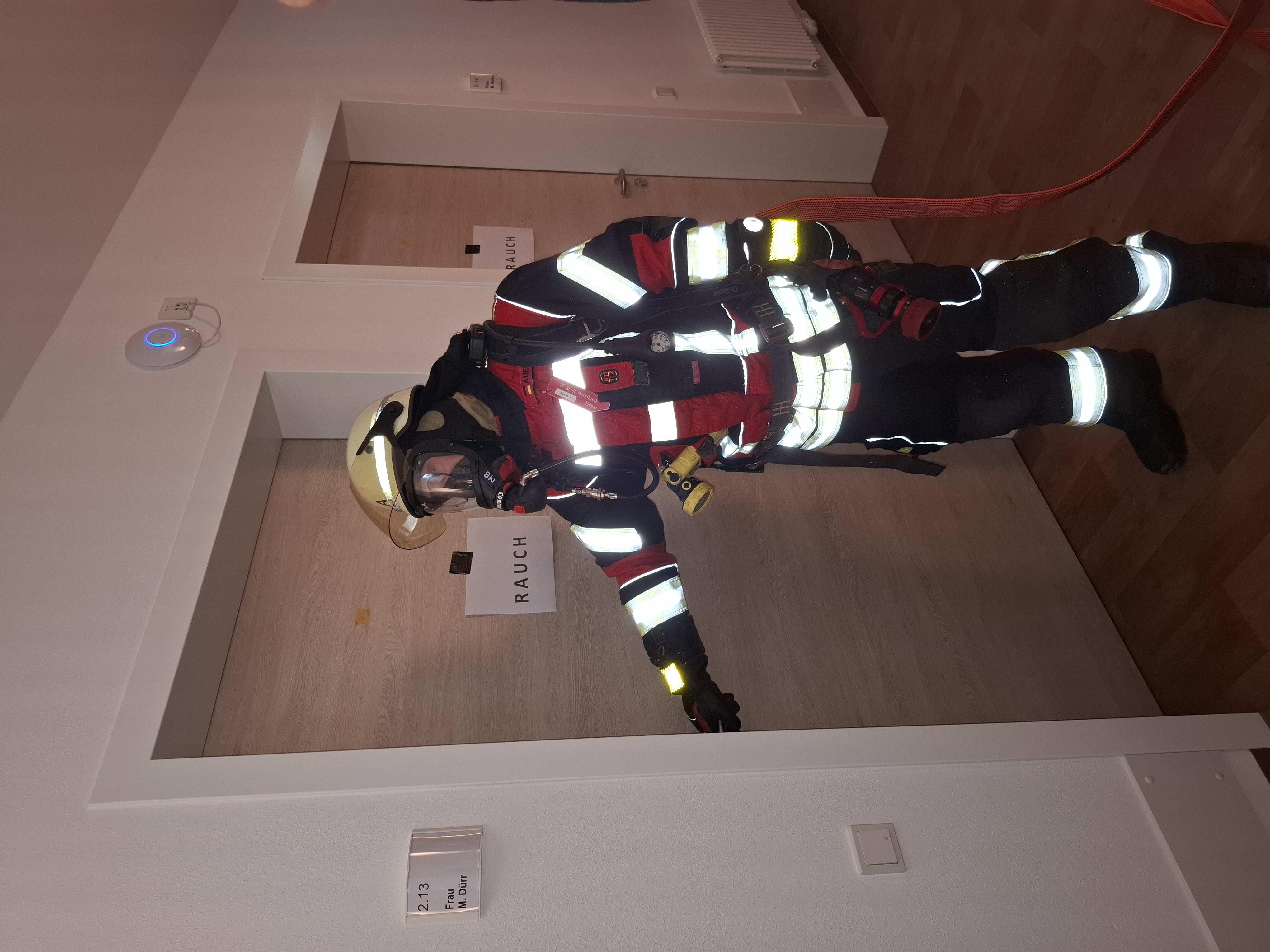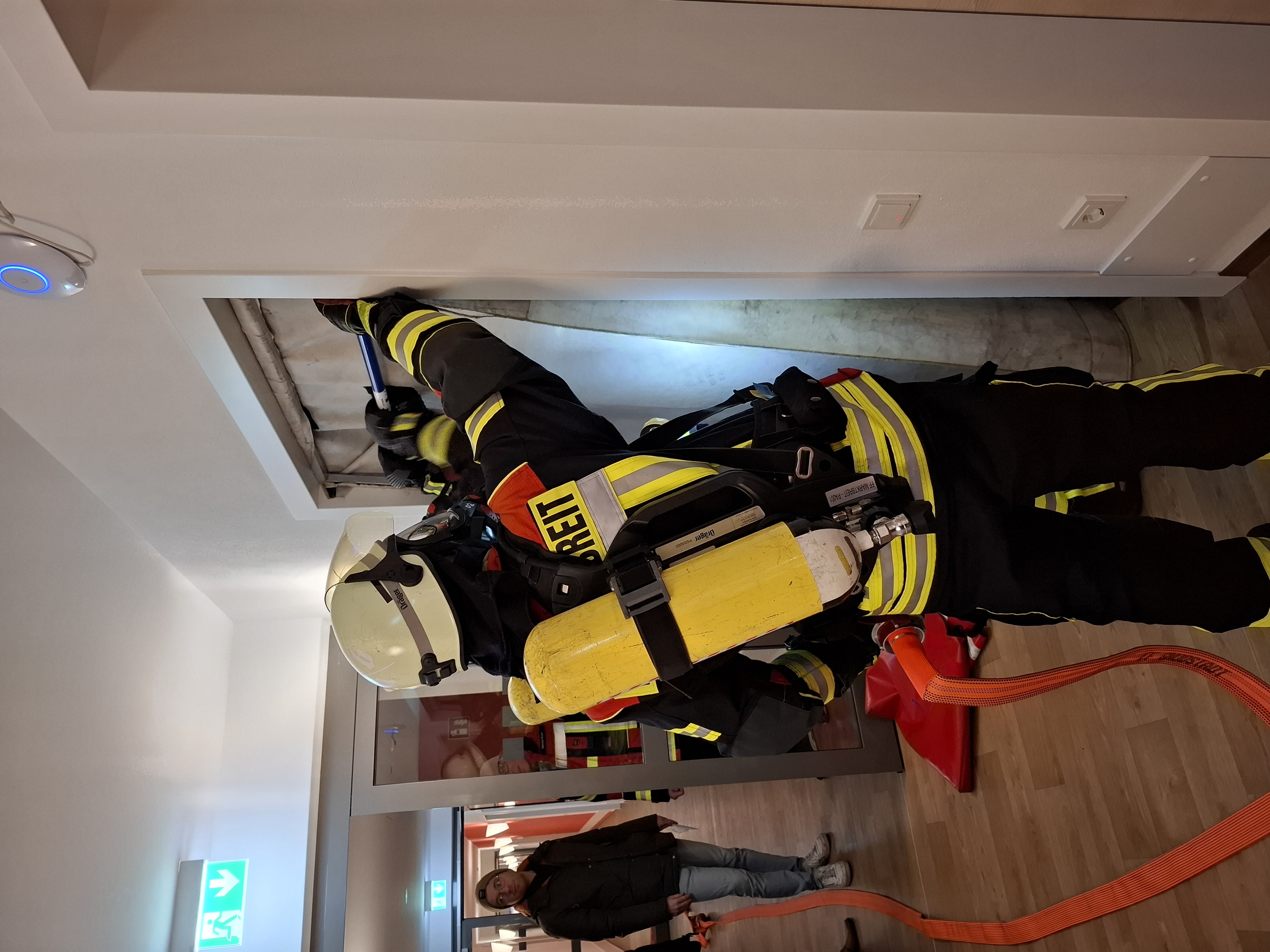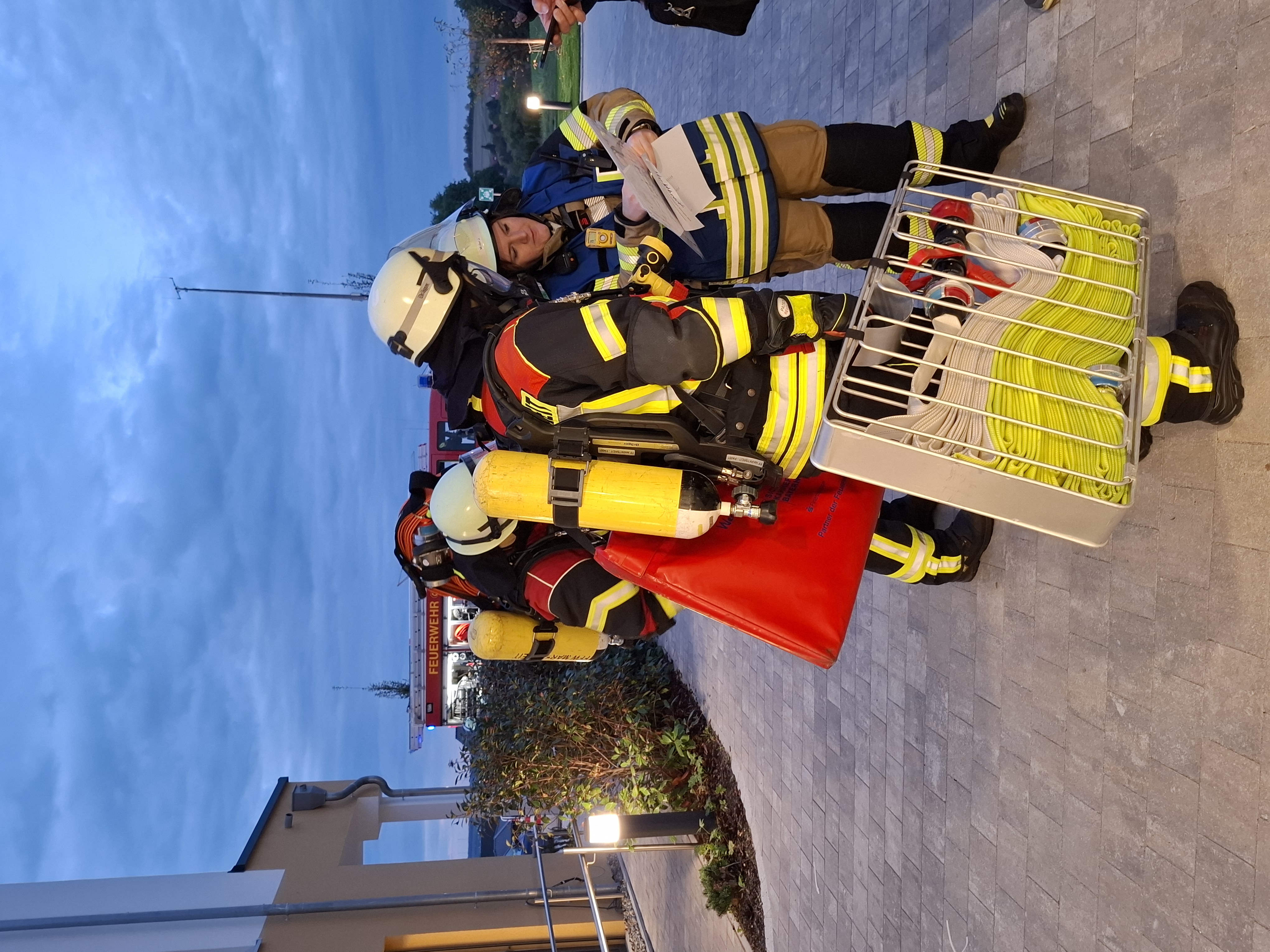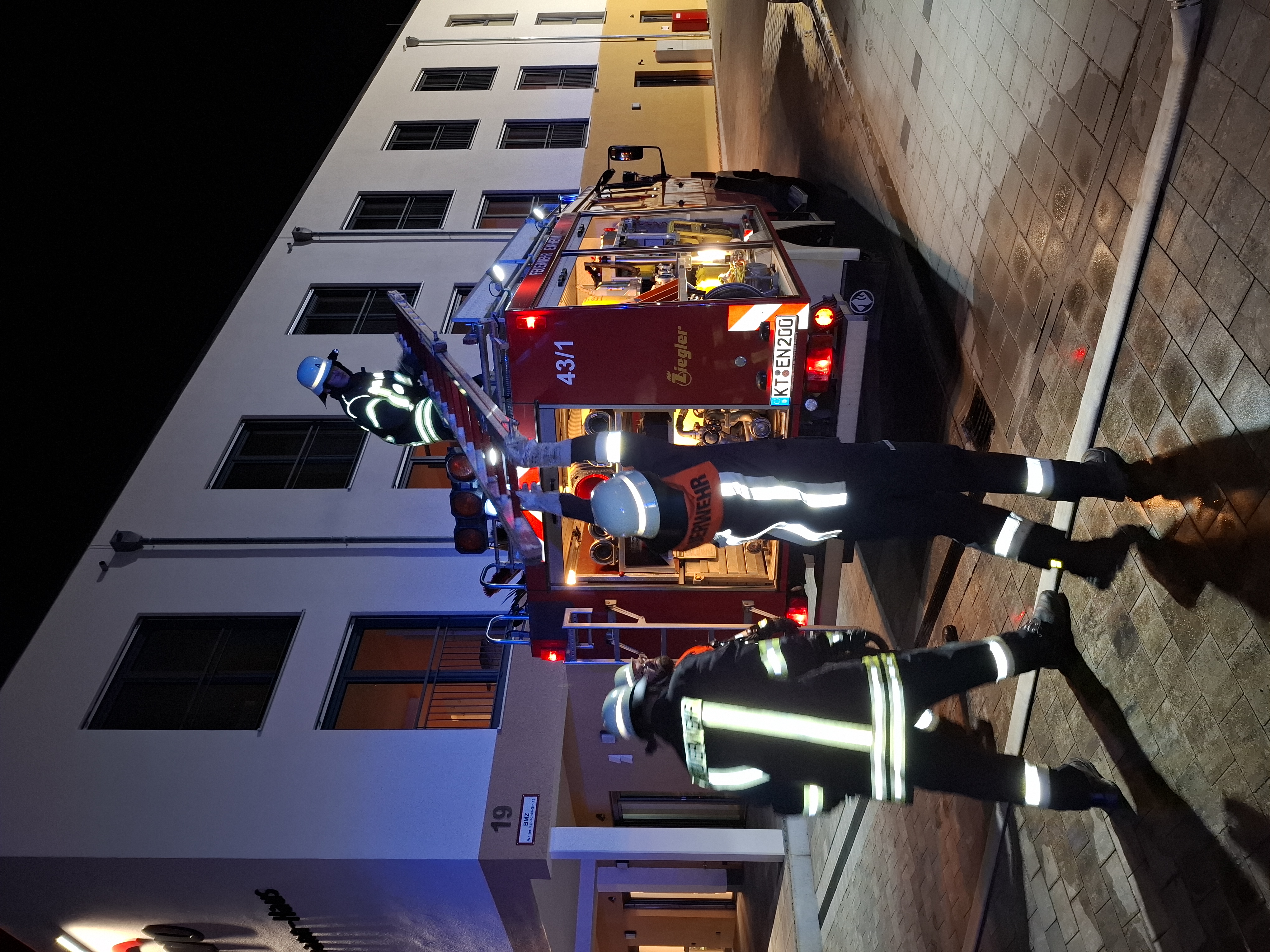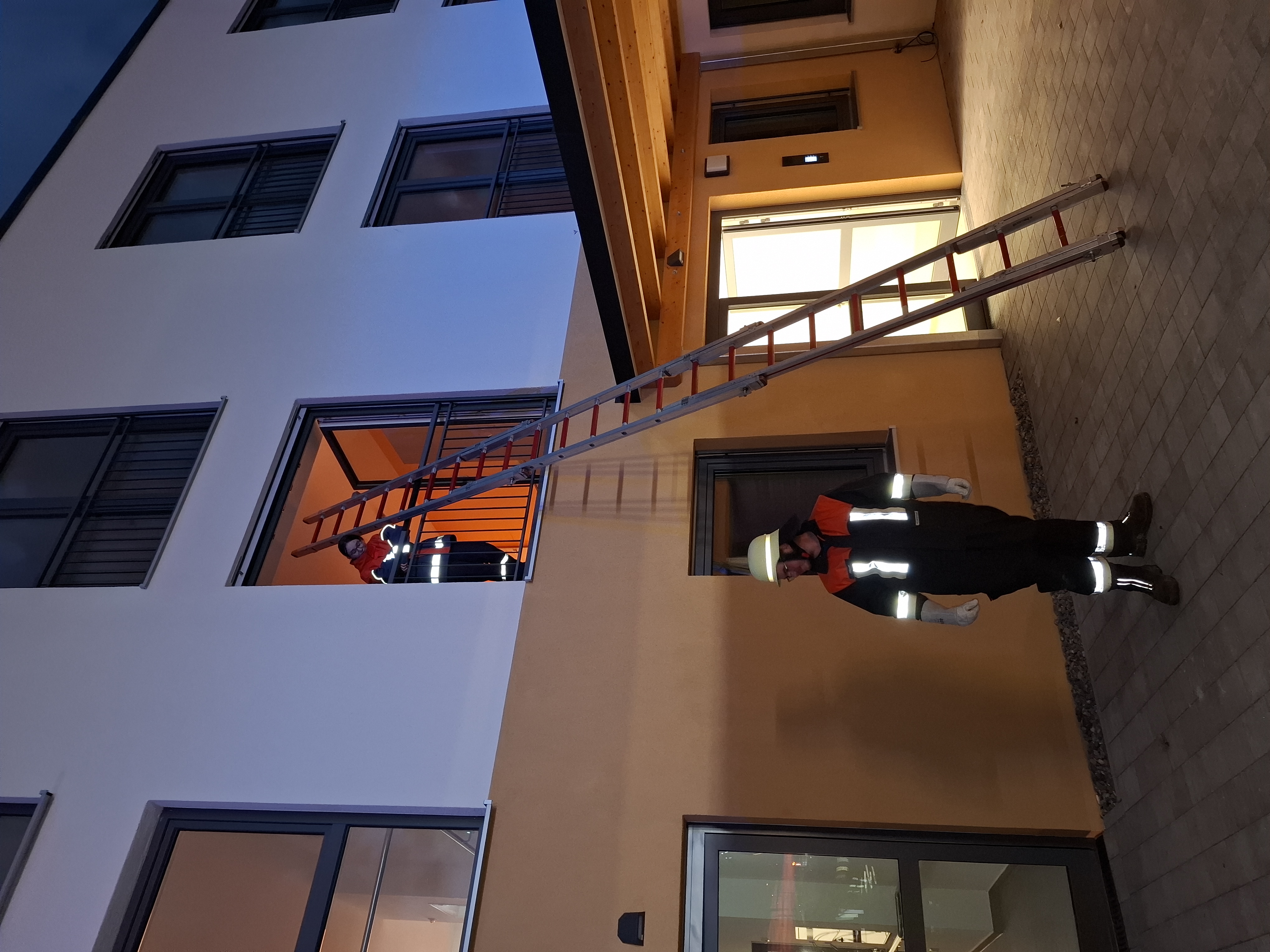 Gegen 19.00 Uhr wurde ein Übungsalarm ausgelöst, bei dem eine starke Rauchentwicklung gemeldet wurde. Beim Eintreffen der ersten Kräfte stellte sich die Lage als kritischer Brandfall mit mehreren vermissten Personen dar, weshalb sofort eine umfangreiche Menschenrettung eingeleitet wurde. Mehrere Trupps unter schwerem Atemschutz durchsuchten das verrauchte Gebäude systematisch nach Vermissten. Insgesamt konnten acht Personen auf verschiedene Arten erfolgreich gerettet werden. Parallel dazu wurde die Brandbekämpfung im Inneren des Gebäudes eingeleitet und ein Außenangriff vorbereitet.