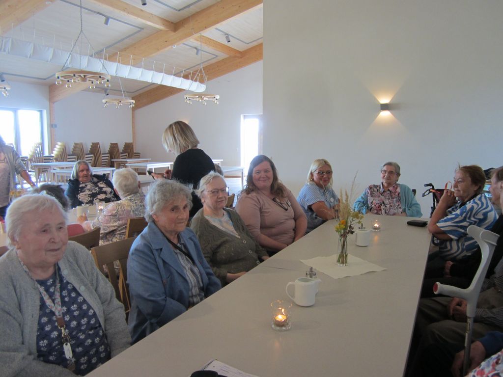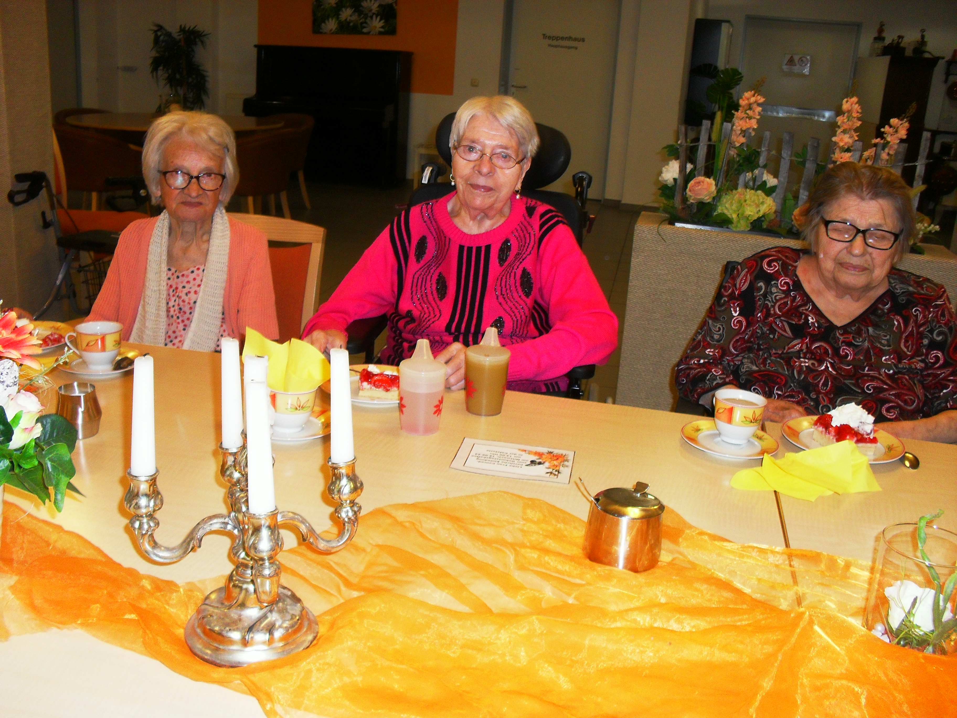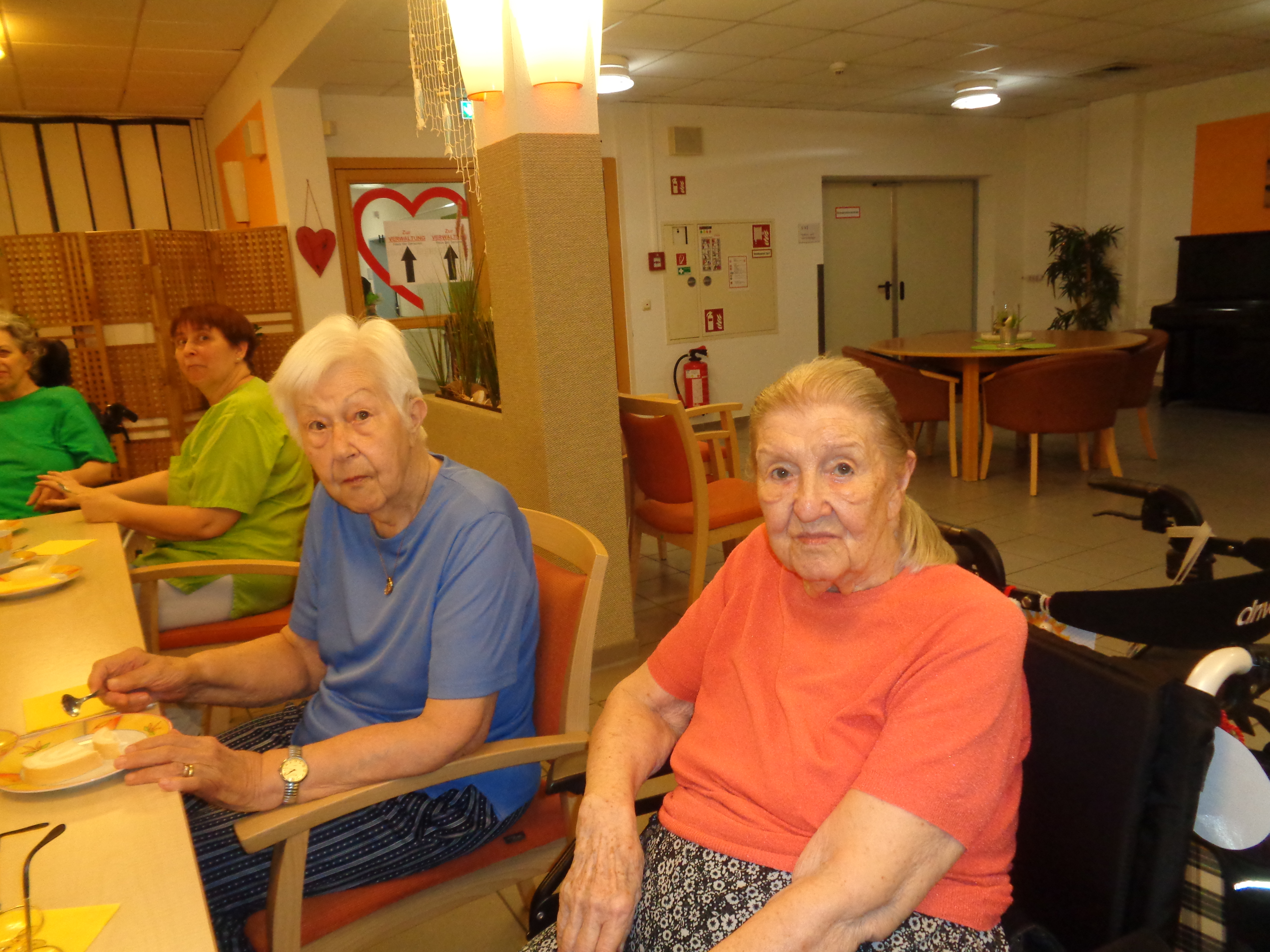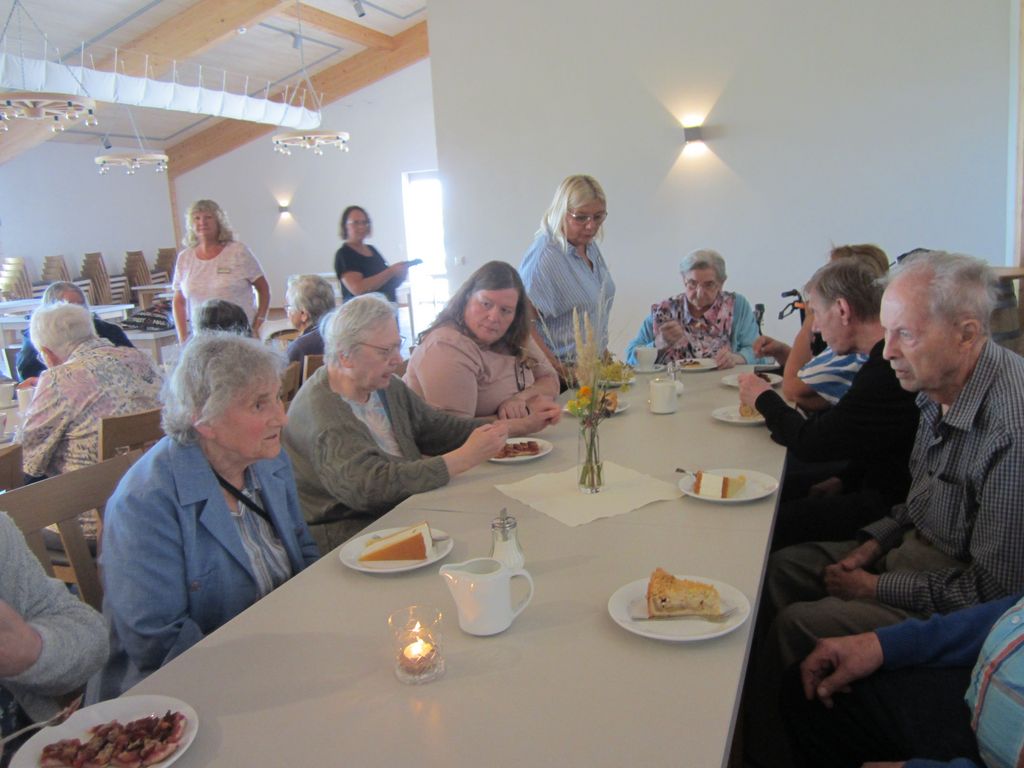 Alle Bewohnerinnen und Bewohner, die in den Monaten Juli und August Geburtstag hatten, waren zum gemeinsamen Kaffeetrinken und Kuchen essen eingeladen. Dieses Mal hatten sehr viele Geburtstag und die Tafel war entsprechend lang.