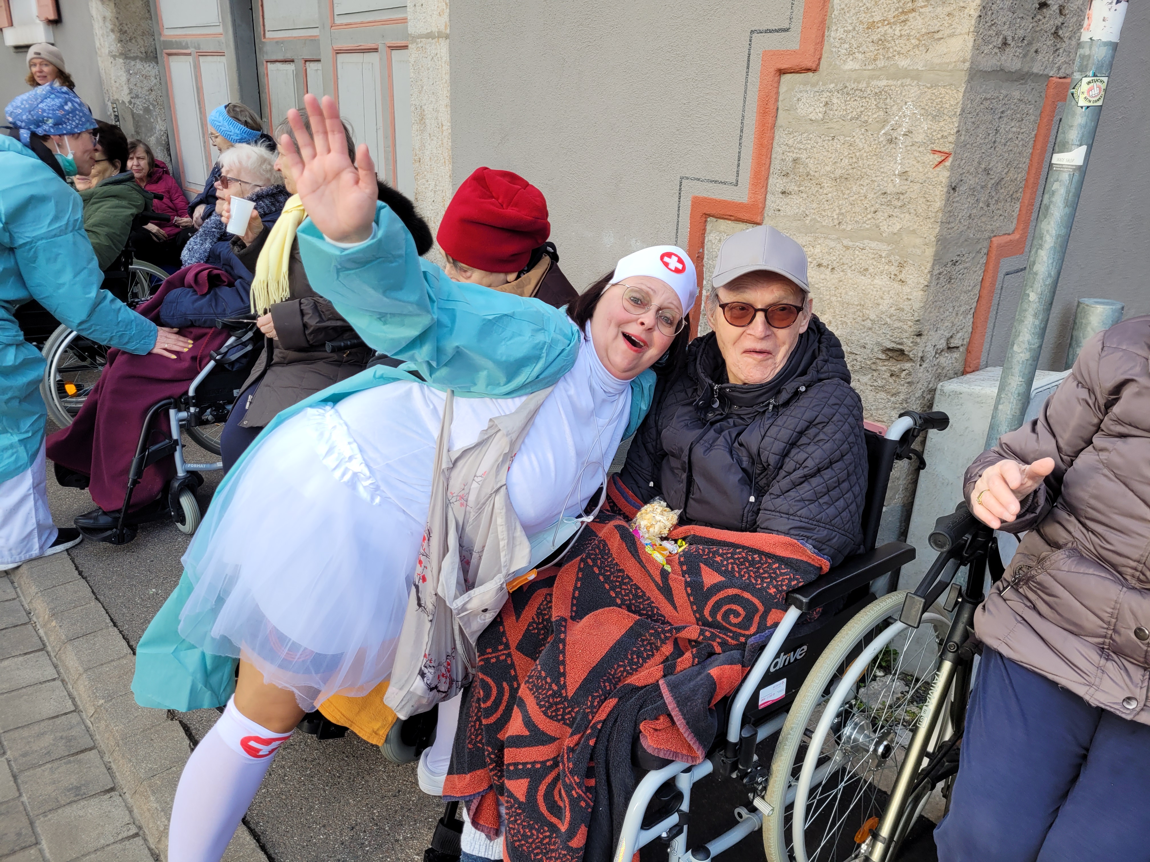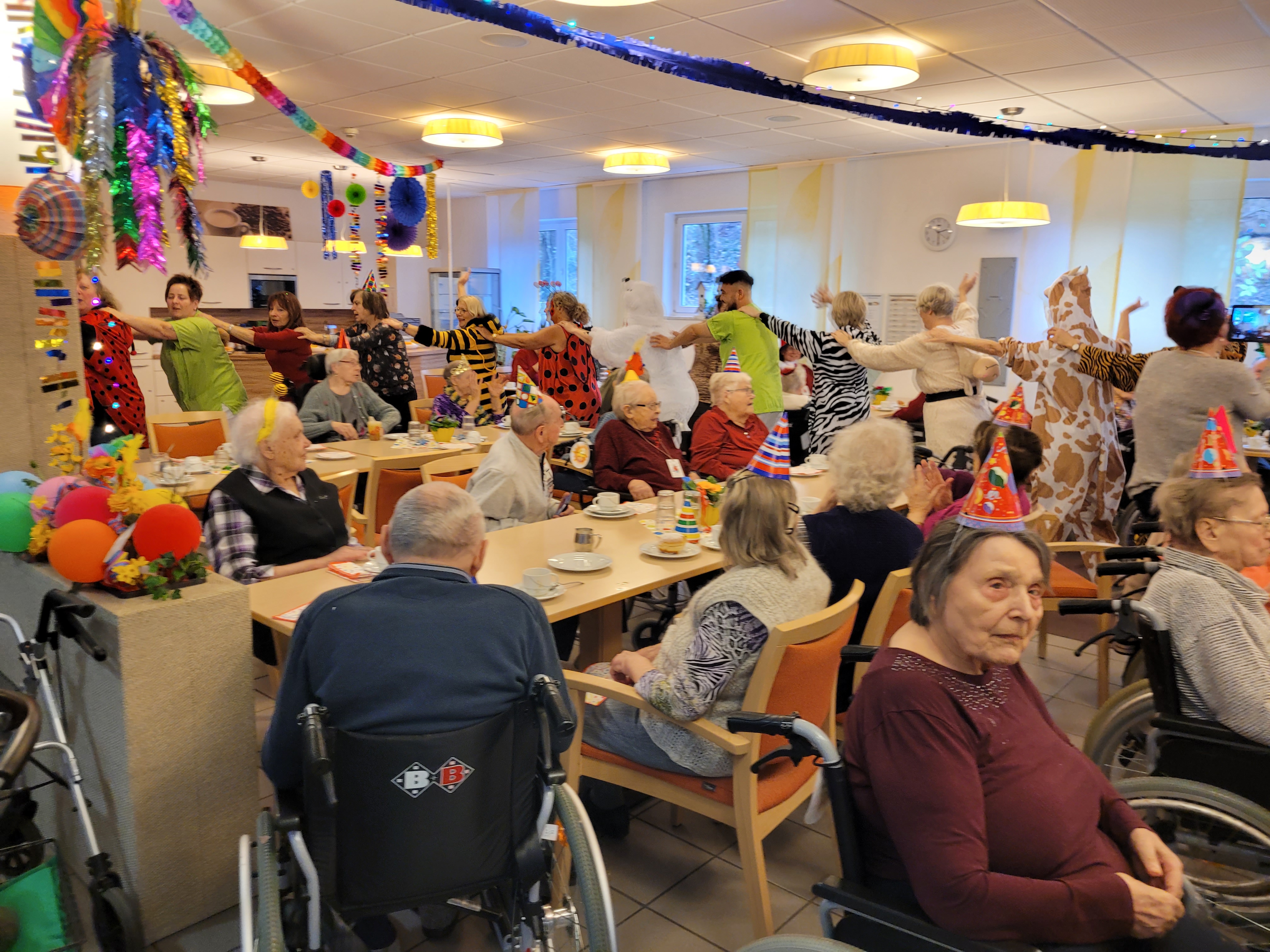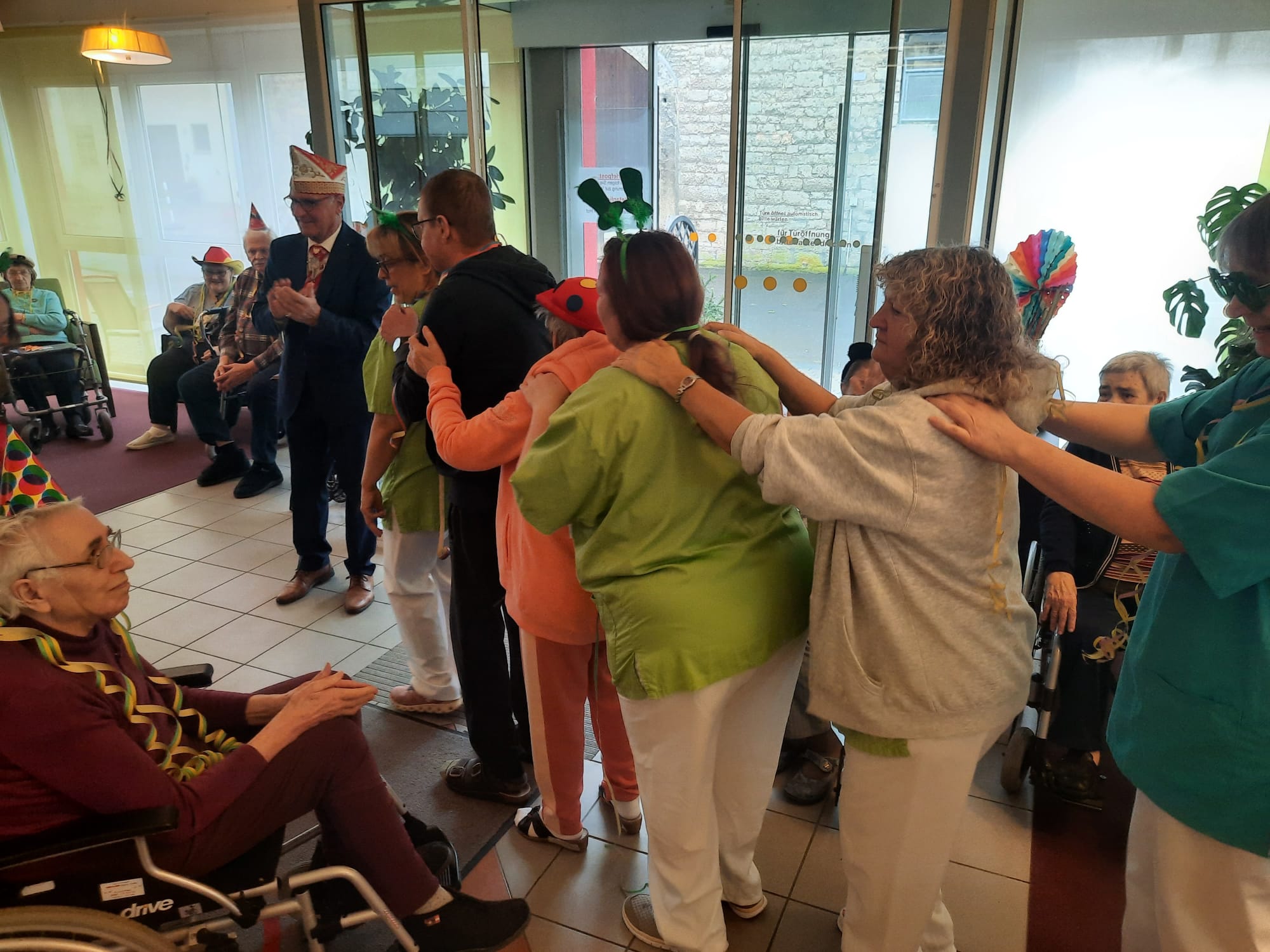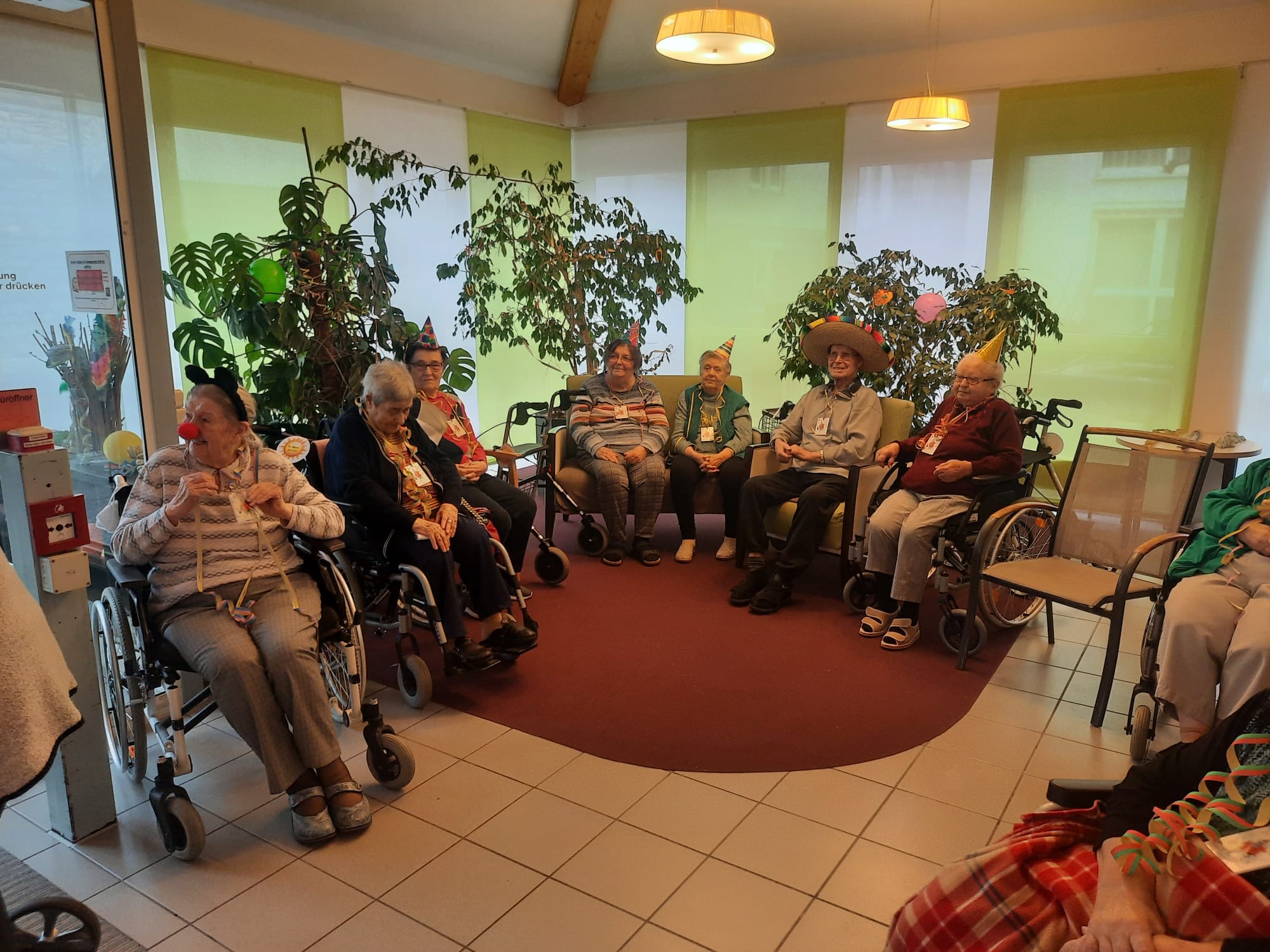 Am Rosenmontag wurde der Fasching ausgelassen gefeiert. Aus allen Wohnbereichen kamen verkleidete Bewohnerinnen und Bewohner, um gemeinsam Fasching zu feiern. Das Team der Sozialen Betreuung hat unter der Leitung von Heidi Krauß mal wieder ein kurzweiliges Programm zusammengestellt und so für beste Stimmung gesorgt. Eine Tanzgruppe aus Gnodstadt bot ihre Kunst dar und nahm die Mitarbeiterinnen und Mitarbeiter sowie die Seniorinnen und Senioren mit zur Polonaise. Eine Büttenrede gab es natürlich auch. Eine unserer Tagespflegegäste hielt sie wieder und erfreute und beindruckte (sie wird demnächst 87 Jahre alt) das Publikum damit. Zur Freude aller gab das Mitarbeiterteam noch den Ententanz zum Besten. Für das leibliche Wohl war selbstverständlich auch gesorgt, es gab Krapfen und Kaffee ☕ und im Anschluss noch Knabbersachen und kalte Getränke.