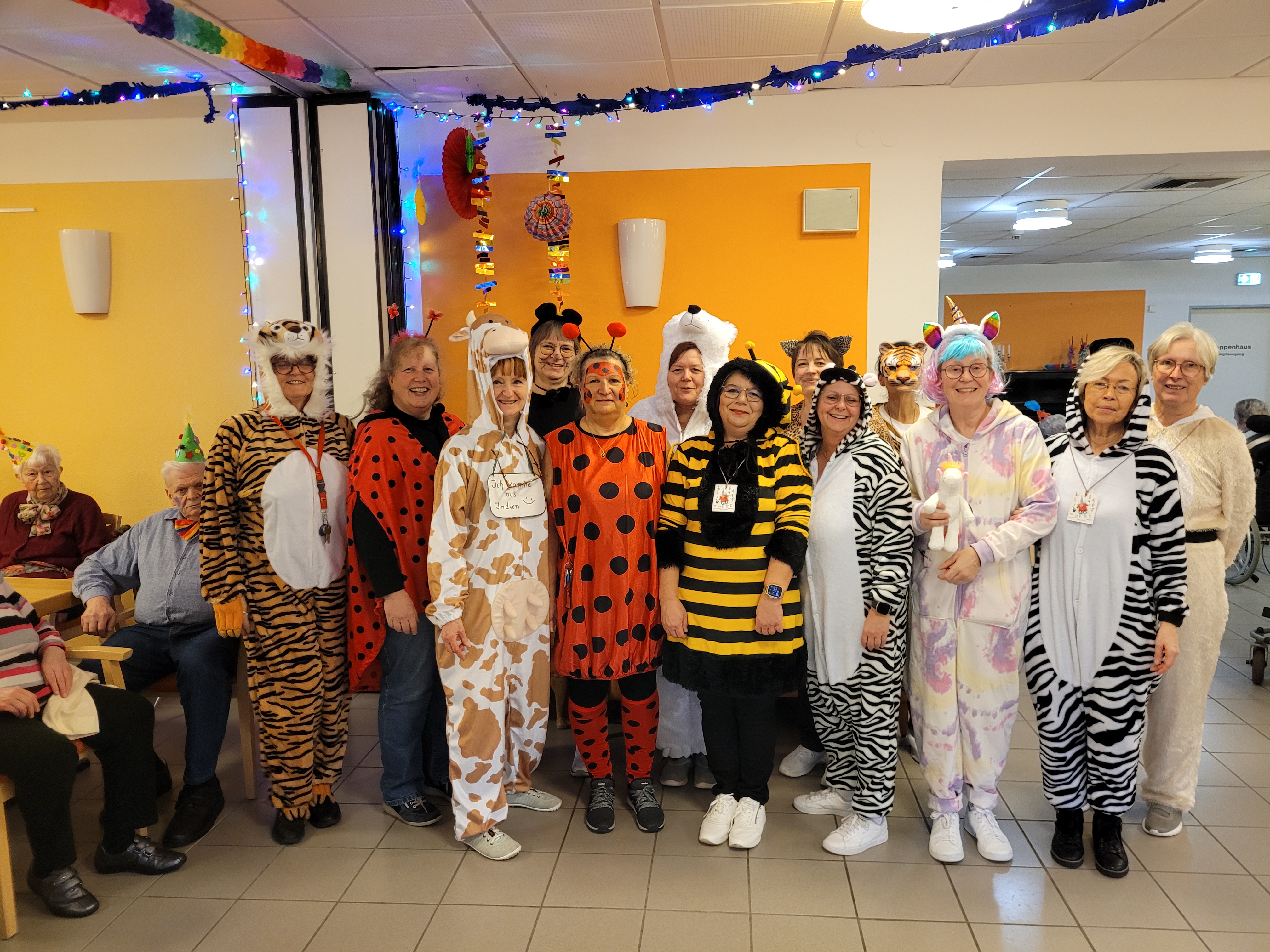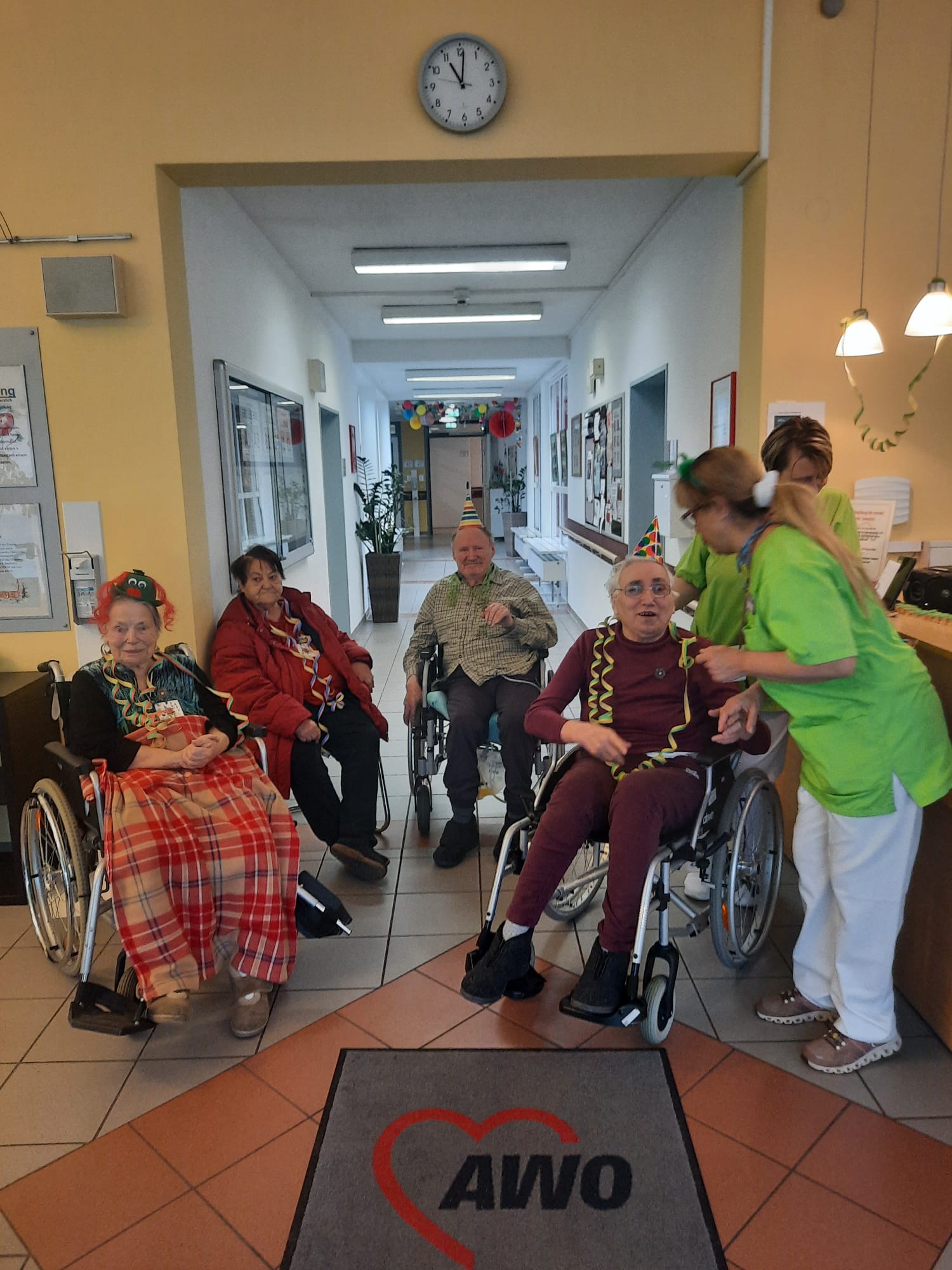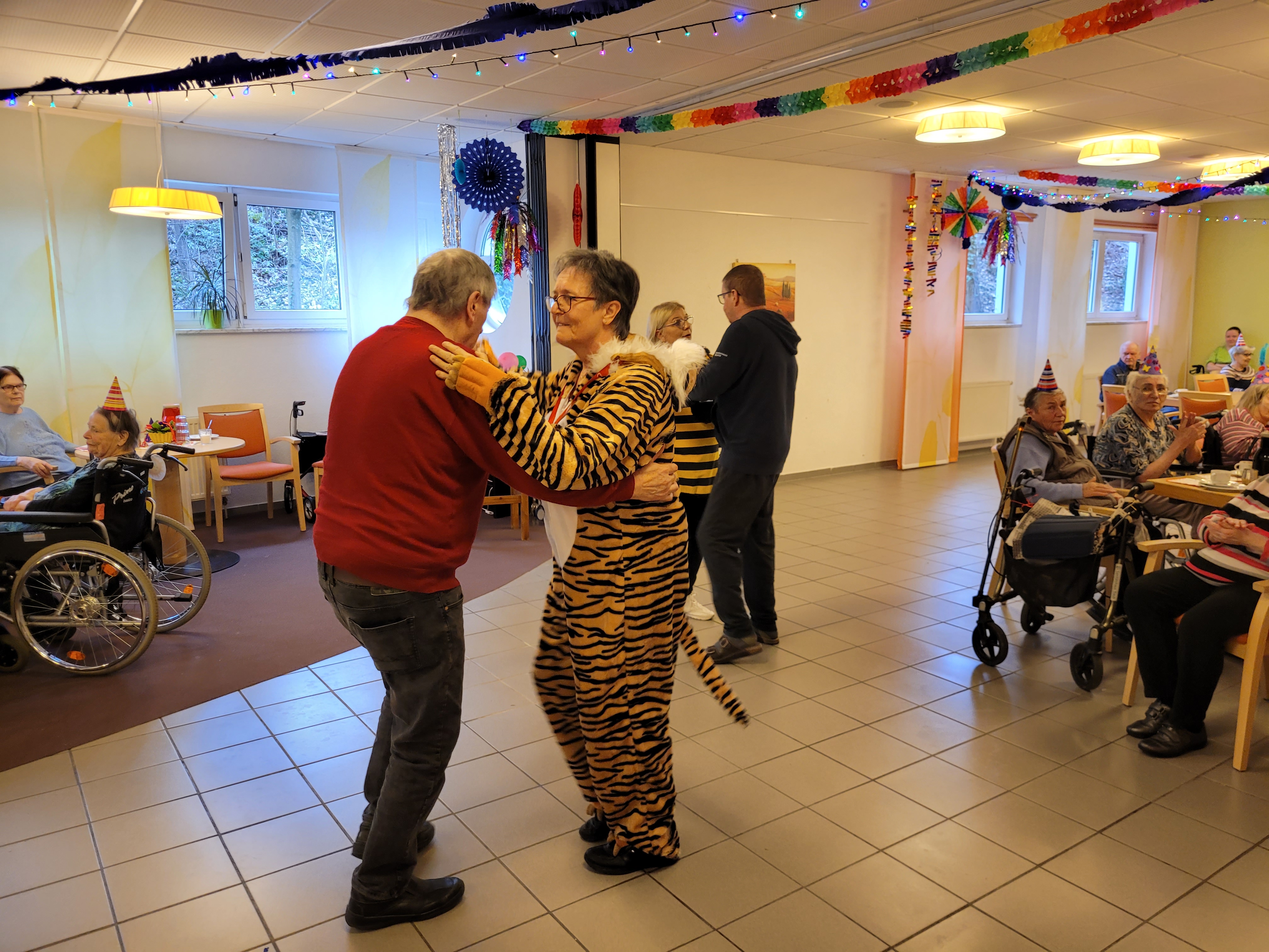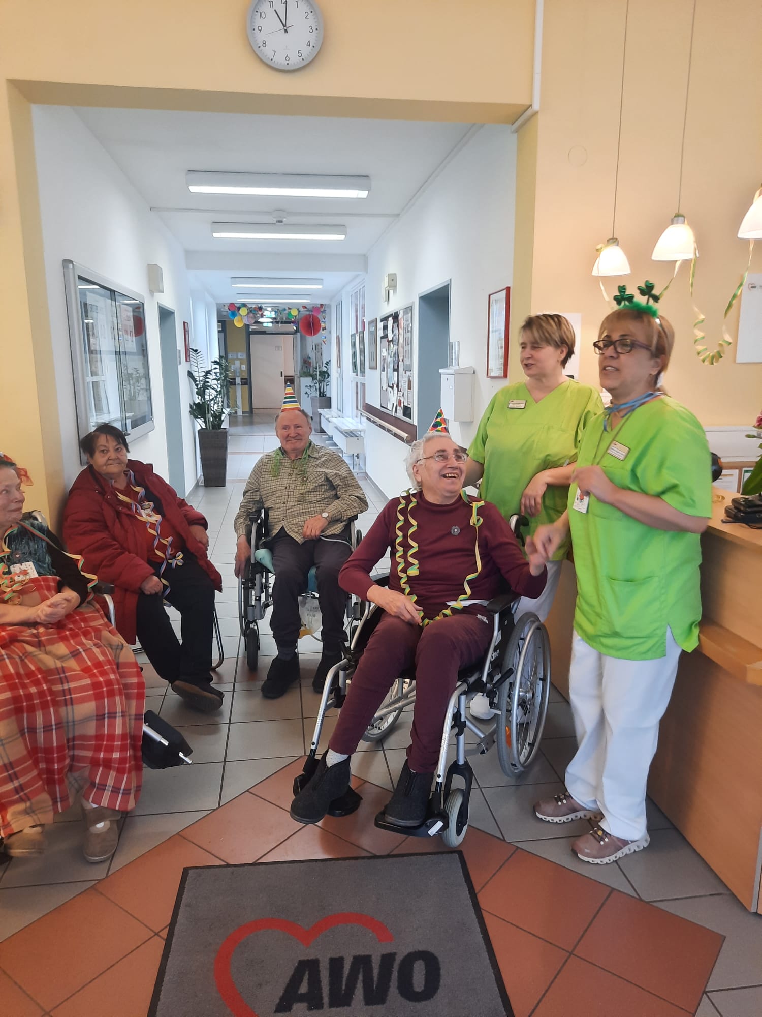 Am Rosenmontag wurde der Fasching ausgelassen gefeiert. Aus allen Wohnbereichen kamen verkleidete Bewohnerinnen und Bewohner, um gemeinsam Fasching zu feiern. Das Team der Sozialen Betreuung hat unter der Leitung von Heidi Krauß mal wieder ein kurzweiliges Programm zusammengestellt und so für beste Stimmung gesorgt. Eine Tanzgruppe aus Gnodstadt bot ihre Kunst dar und nahm die Mitarbeiterinnen und Mitarbeiter sowie die Seniorinnen und Senioren mit zur Polonaise. Eine Büttenrede gab es natürlich auch. Eine unserer Tagespflegegäste hielt sie wieder und erfreute und beindruckte (sie wird demnächst 87 Jahre alt) das Publikum damit. Zur Freude aller gab das Mitarbeiterteam noch den Ententanz zum Besten. Für das leibliche Wohl war selbstverständlich auch gesorgt, es gab Krapfen und Kaffee ☕ und im Anschluss noch Knabbersachen und kalte Getränke.