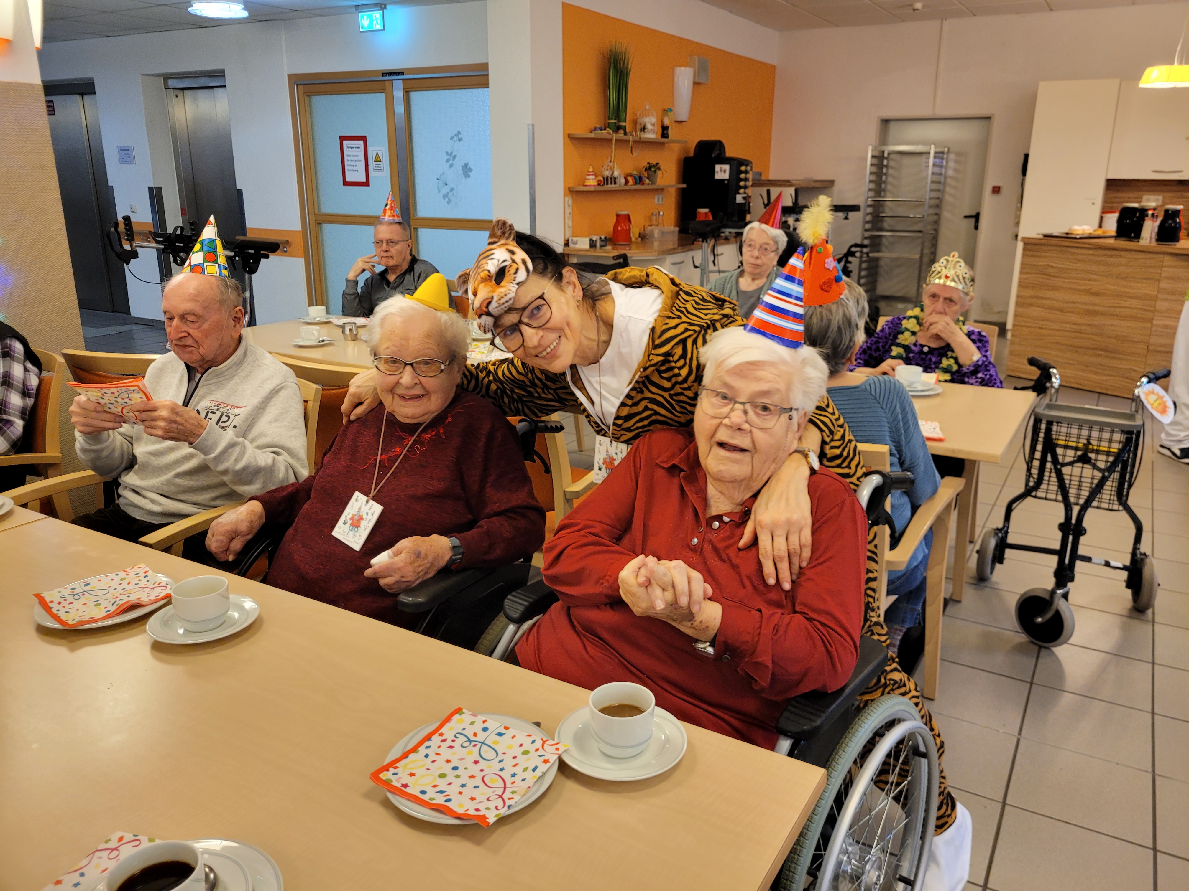 Es ist immer ein Highlight für alle, wenn sich die Geburtstagskinder der vergangenen Monate in der Cafeteria zum gemeinsamen Feiern treffen. Die Bewohnerinnen und Bewohner freuen sich, dass es leckeren Kuchen und Kaffee gibt und dass die Mitarbeiterinnen und Mitarbeiter der sozialen Betreuung die Feier wunderschön gestalten. Besonders interessant ist dann auch jedesmal die Frage, wer der oder die Älteste bzw. Jüngste in der Runde ist.