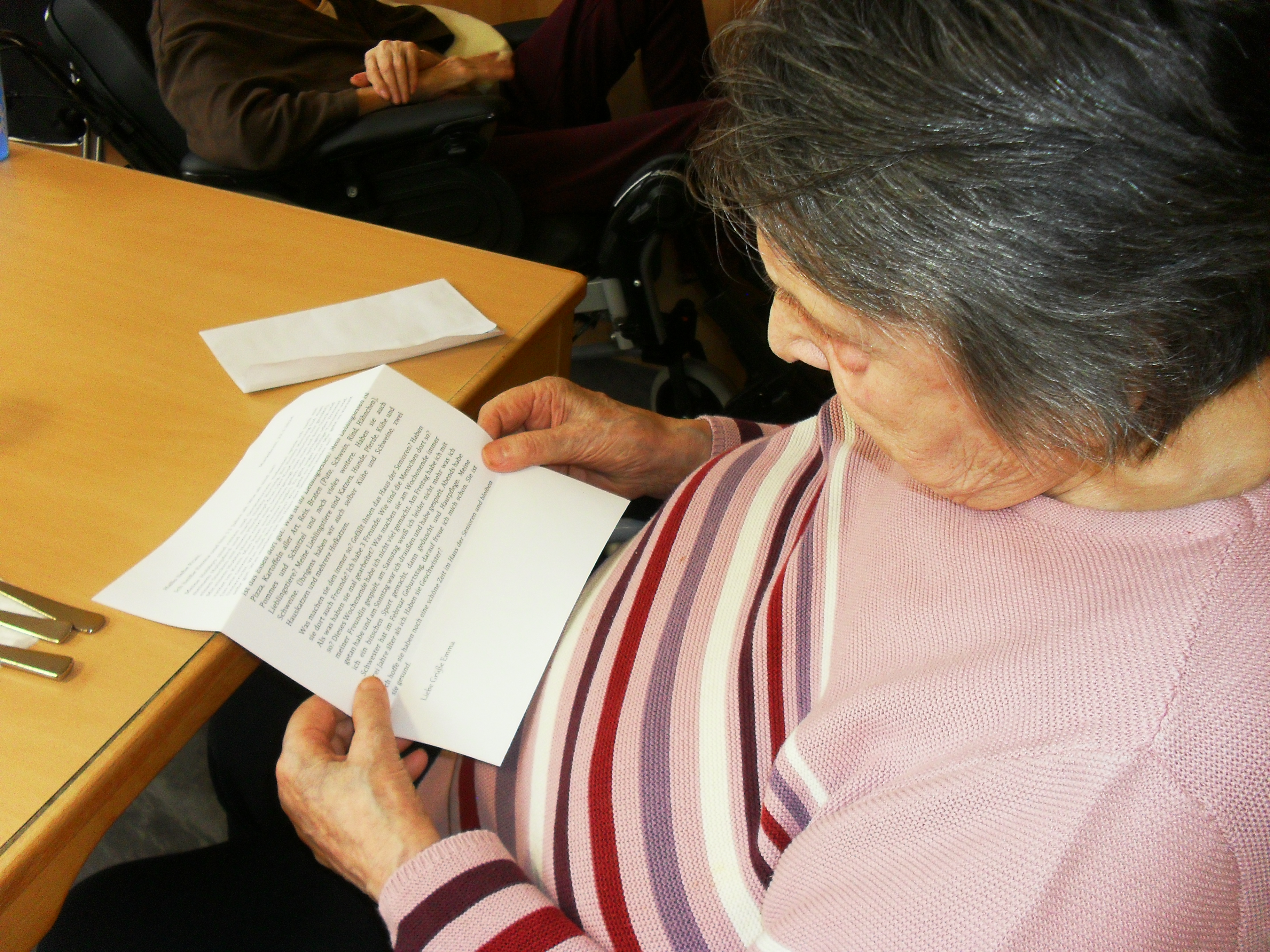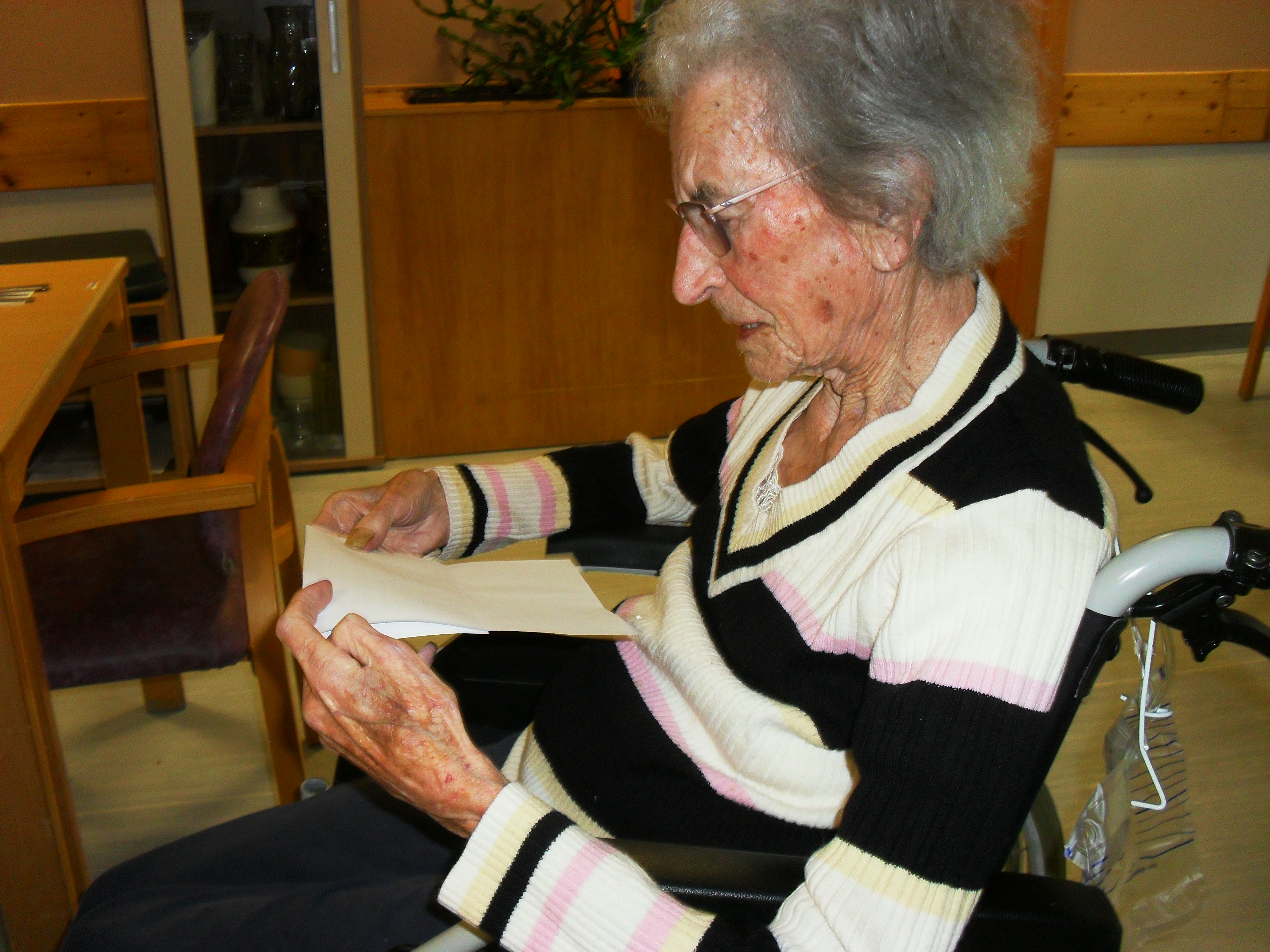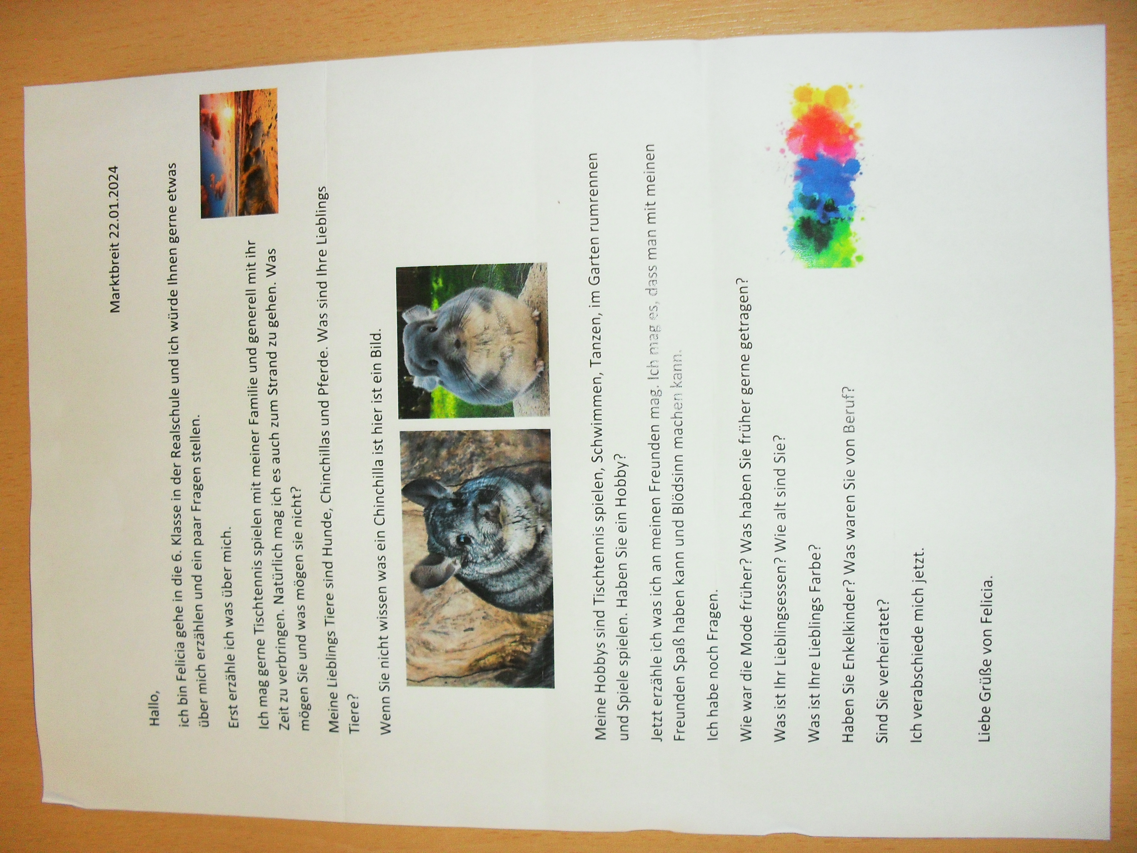 Deshalb haben Schüler*innen der sechsten Klasse der Realschule Marktbreit dies im Deutschunterricht geübt und Briefe an die Senior*innen hier im Haus geschrieben. Die Schüler*innen brachten die Briefe persönlich in die Wohnbereiche. Dort suchten sie sich eine Bewohnerin oder einen Bewohner aus, dem sie den Brief überreichten bzw. teilweise sogar vorlasen. Einige Schüler*innen stellten noch Fragen und erzählten, warum sie die Briefe geschrieben haben. Die Bewohner*innen waren sehr erfreut und viele von ihnen haben die Briefe in der großen Runde vorgelesen. Eine Mitarbeiterin der Betreuung hat zusammen mit den Bewohner*innen einen gemeinsamen Antwortbrief geschrieben.