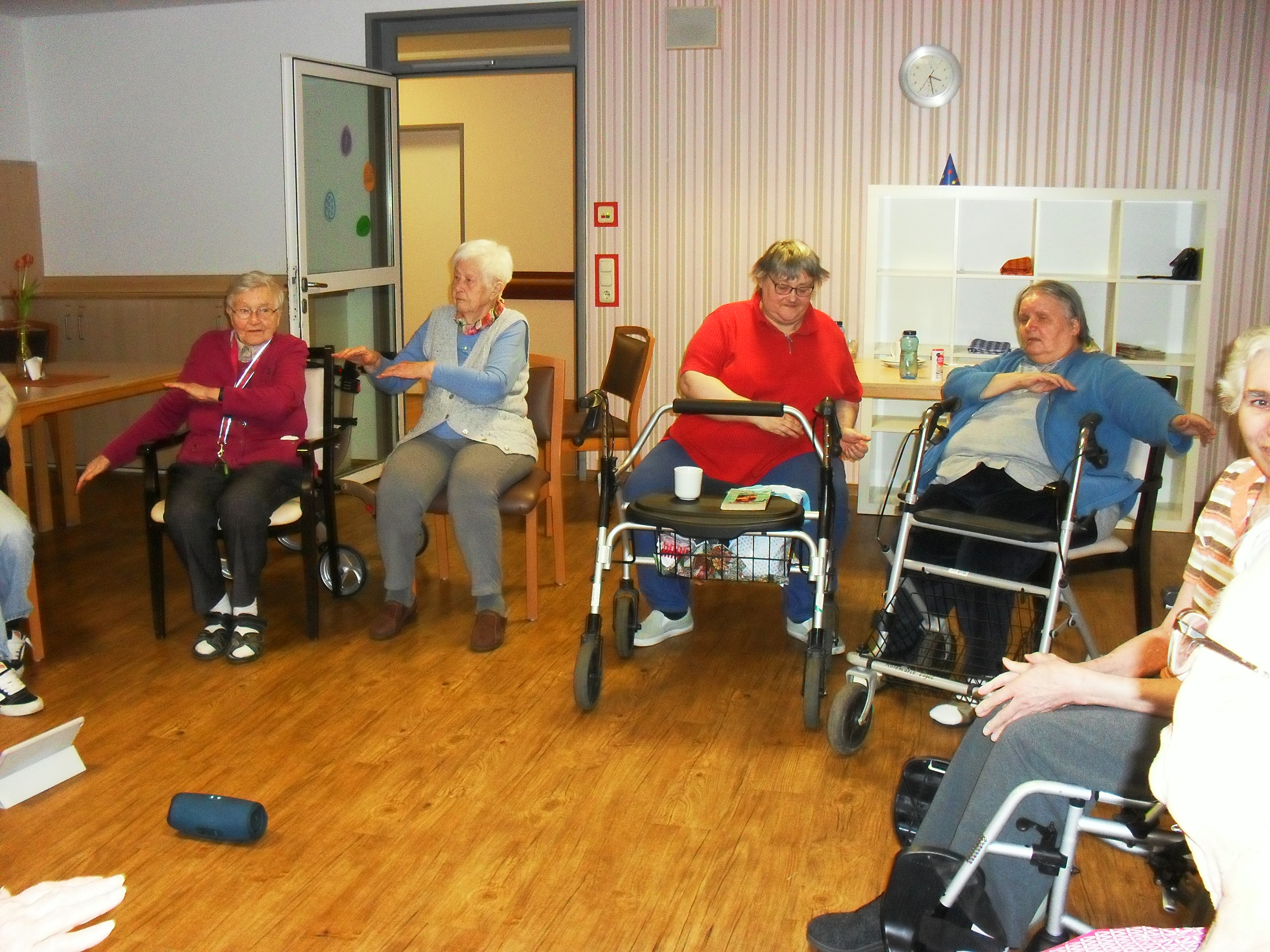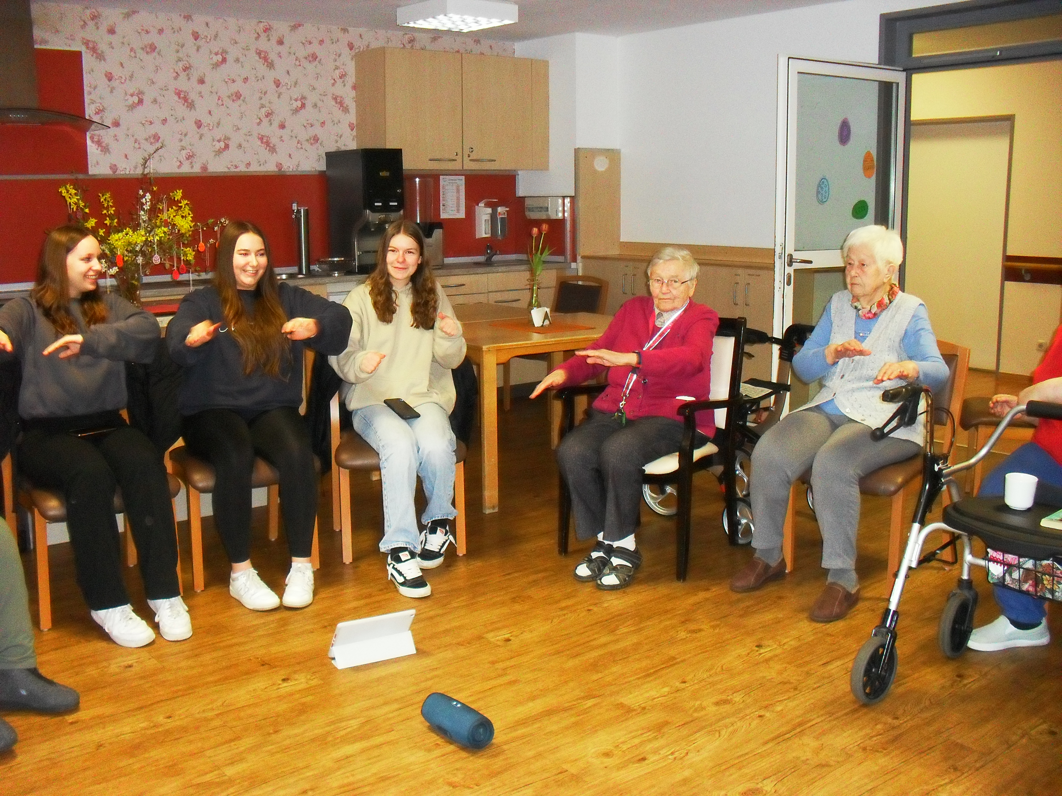 Im Rahmen ihres P-Seminars "Ausschmückung des Alltags im Haus der Senioren" besuchen Schüler*innen in regelmäßigen Abständen die Bewohner*innen hier im Haus der Senioren. Eine Gruppe macht mit den Senior*innenKontakt zum Gymnasium Marktbreit Sitztanz, eine zweite Gruppe bäckt und eine dritte Gruppe bietet Brettspiele an. Die Bewohner*innen freuen sich immer sehr über diese Besuche und machen begeistert mit.