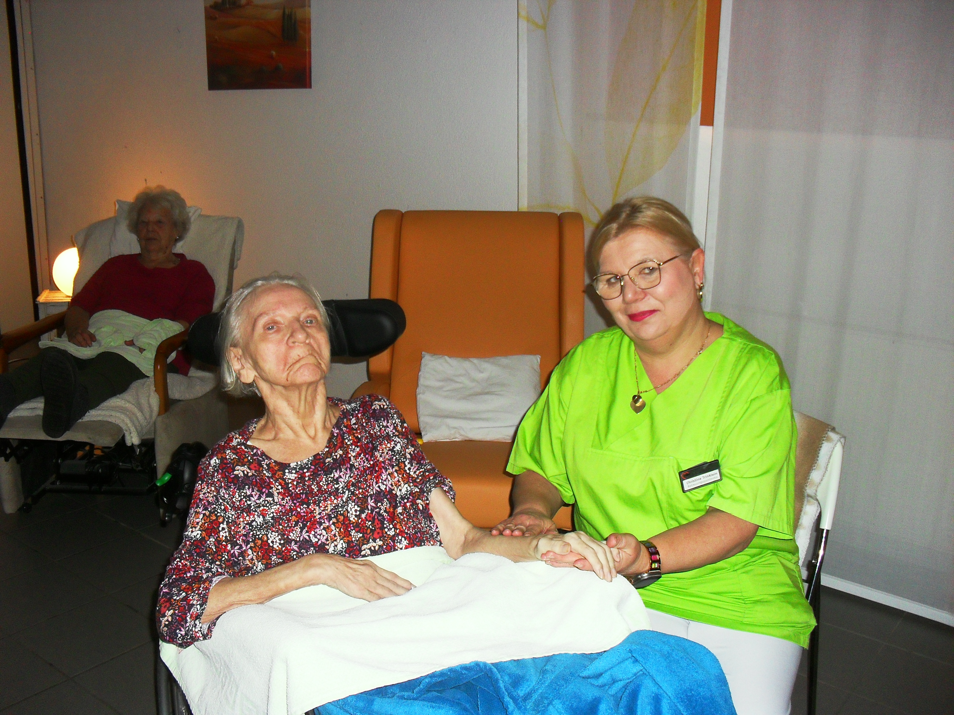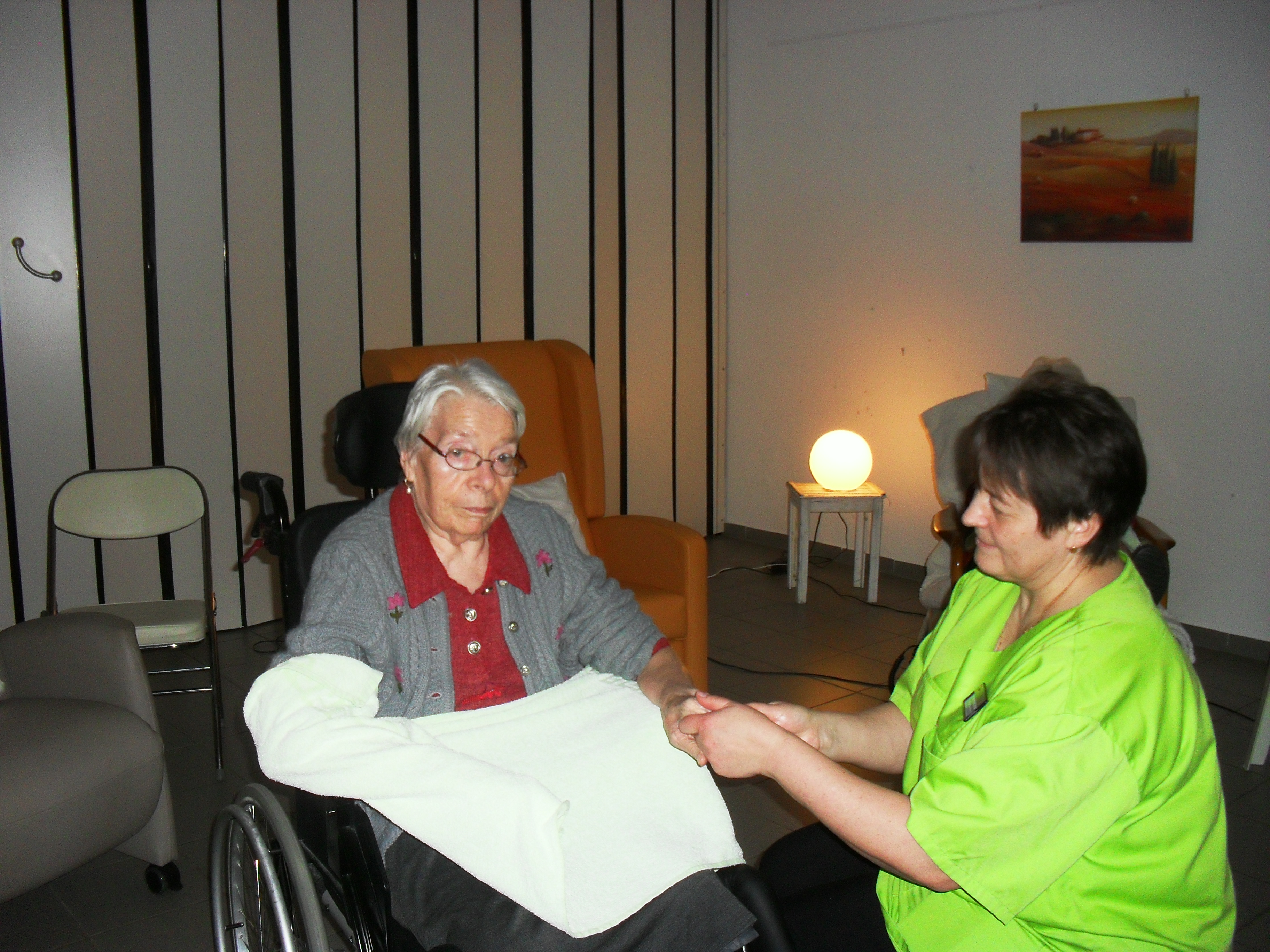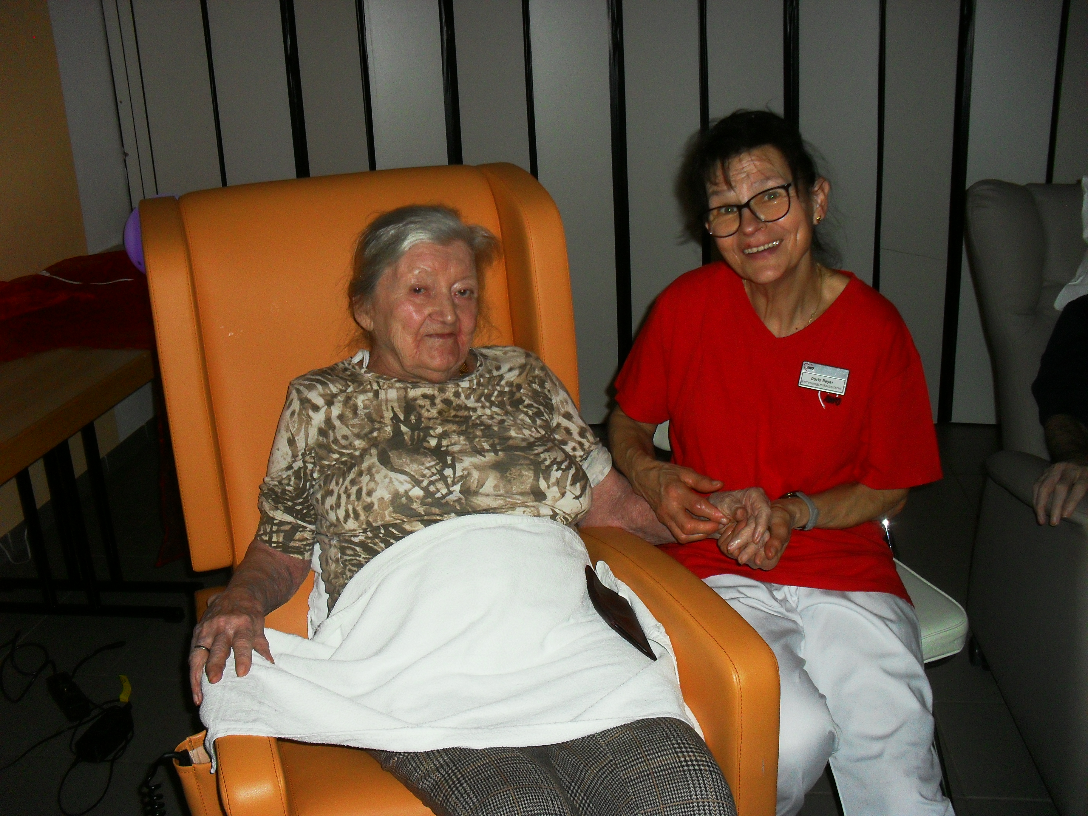 Zweimal im Jahr finden im Haus der Senioren die Wellnesstage für die Bewohner*innen und die Tagespflegegäste statt. Dieses Angebot wird jedesmal mit Begeisterung angenommen, manche kommen sogar mehrfach. Alle genießen die angebotenen Handmassagen, wer mag bekommt auch eine Kopfmassage. Ab und zu wirkt die Behandlung so entspannend, dass die Senior*innen dabei einschlafen. Ein großes Dankeschön an das Team der Betreuung, das dieses Event jedesmal mit viel Personal- und Materialaufwand auf die Beine stellt.