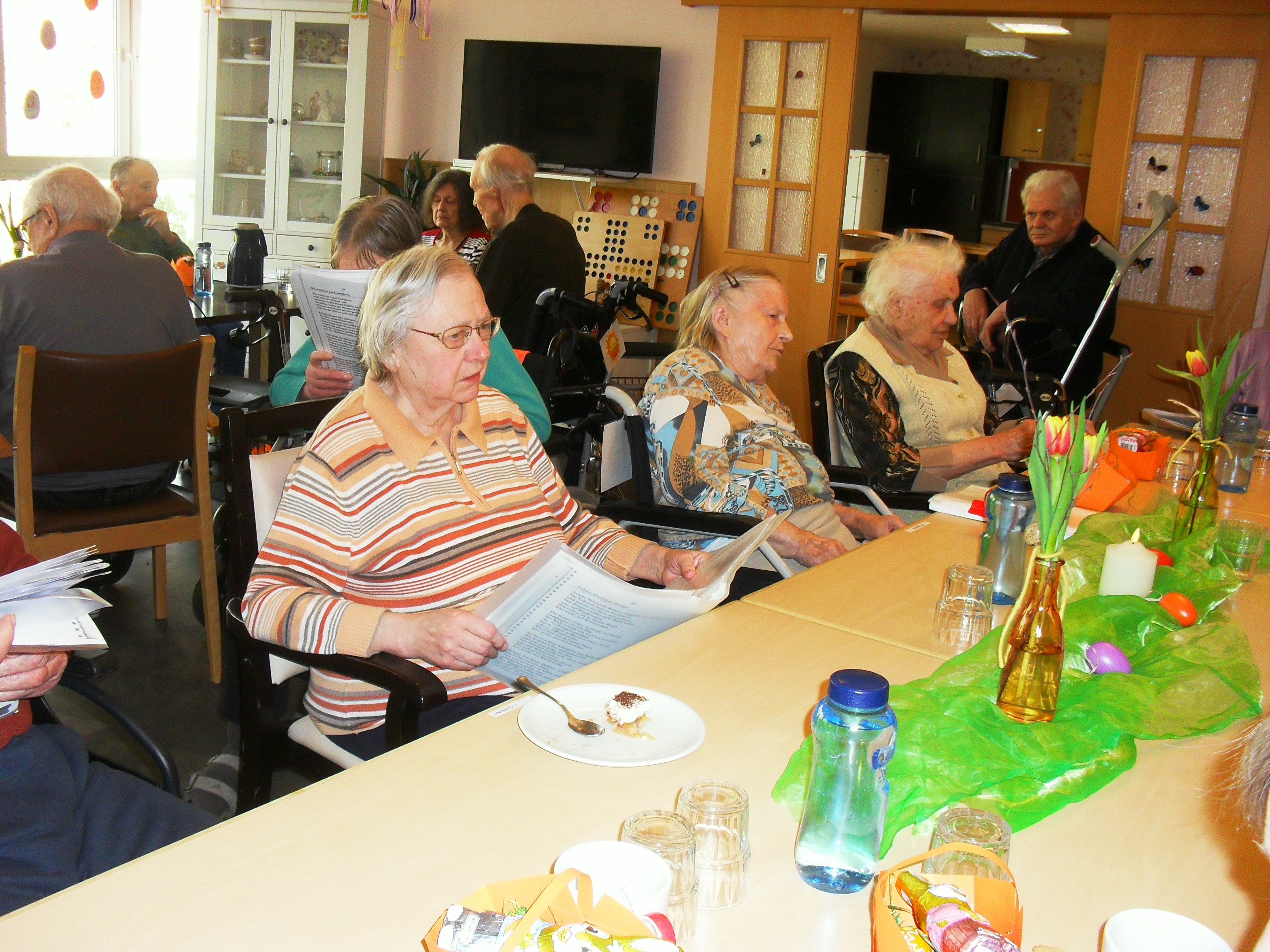 Zum Geburtstagskaffee waren alle Geburtstagskinder der Monate März und April eingeladen. Bei Kaffee und Torte tauschten sich die Bewohnerinnen und Bewohner über vieles wie zum Beispiel, wie früher Geburtstage gefeiert wurden aus. Außerdem interessiert immer alle brennend, wer denn die oder der Älteste in der Runde ist. Das Team der Betreuung hatte ein kurzweiliges Programm vorbereitet und auch die Tafel wieder festlich dekoriert.