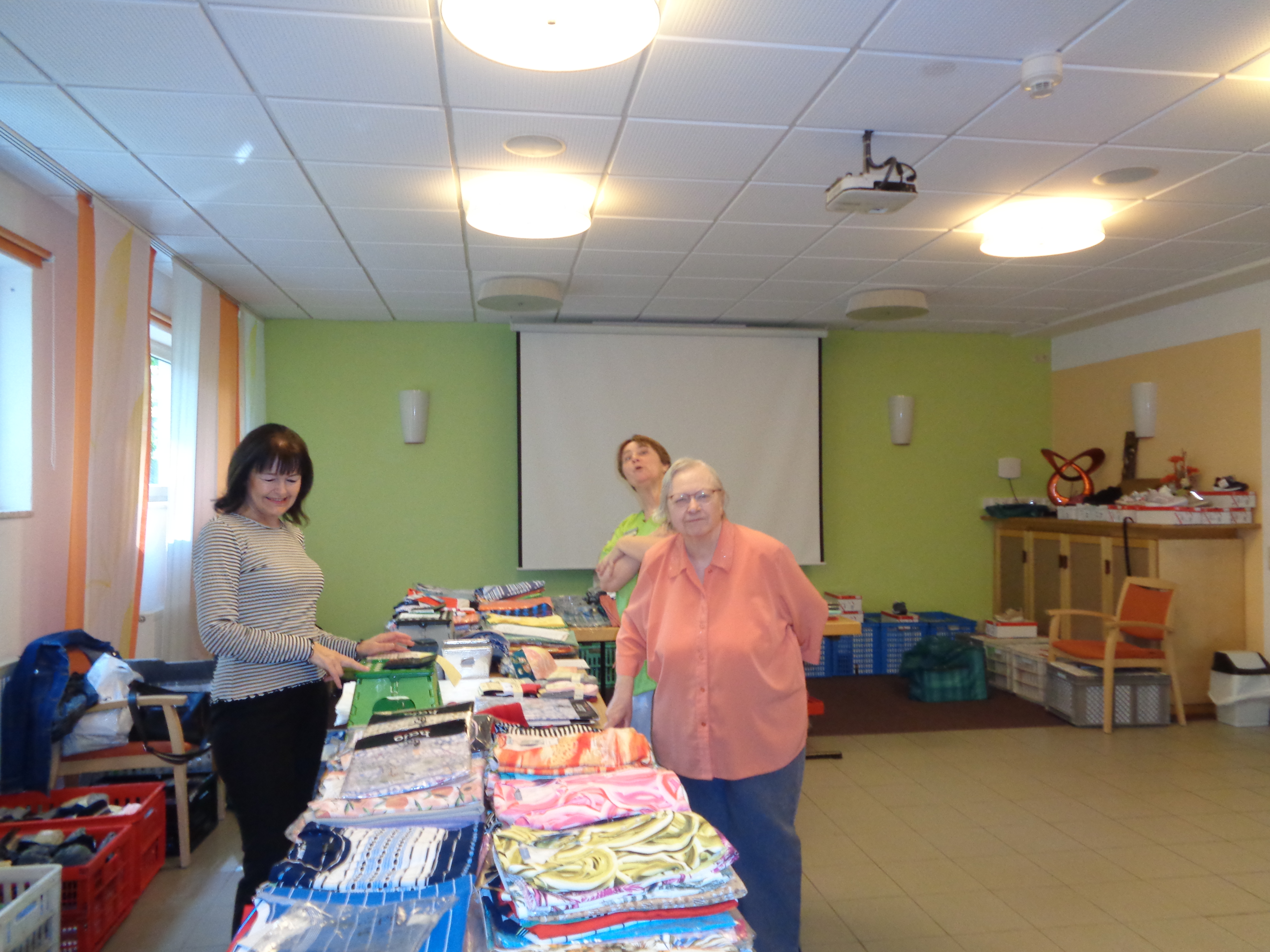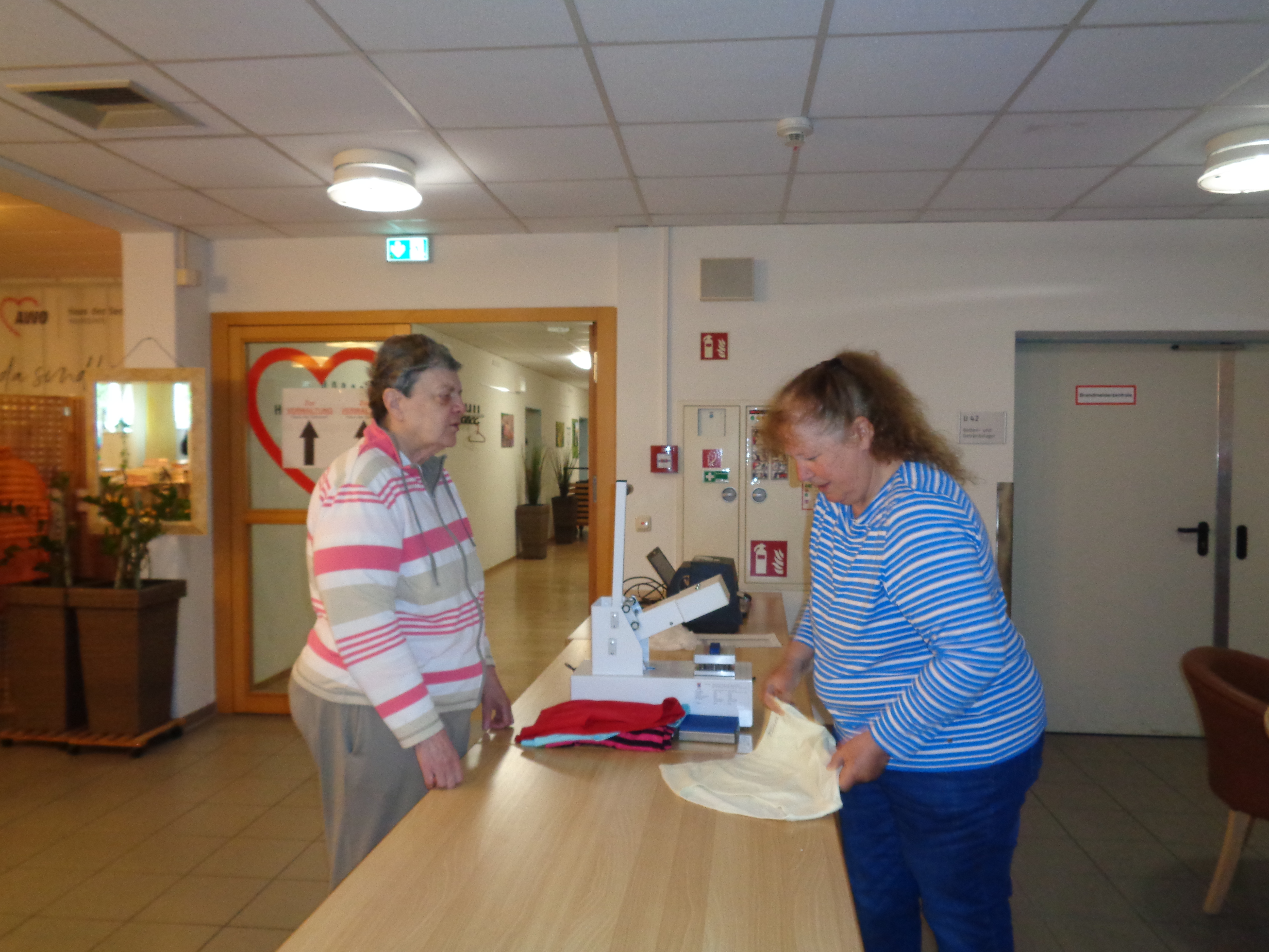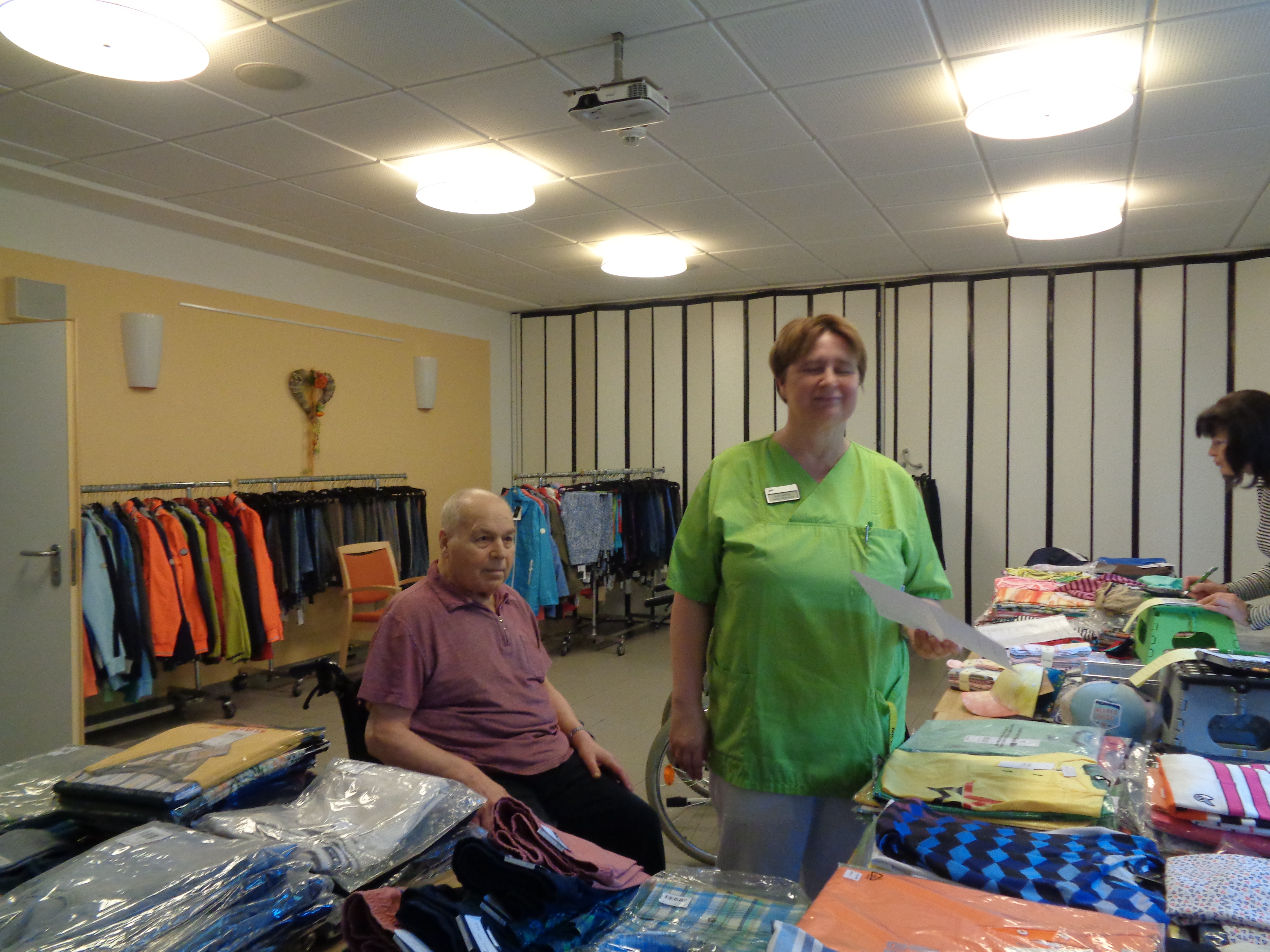 Das Angebot, hier im Haus neue Kleidung zu kaufen, wurde von Bewohnerinnen und Bewohnern und auch von Mitarebeiterinnen und Mitarbeiter rege genutzt. Die Mitarbeiterinnen und Mitarbeiter der Sozialen Betreuung ermöglichten das Einkaufserlebnis durch tatkräftige Unterstützung bei der Anprobe und der Auswahl. Hauswirtschaftsleitung Birgit Wirsing sorgte dafür, dass die neuen Kleidungsstücke nicht verloren gehen, indem sie alles sofort mit Namen zeichnete.