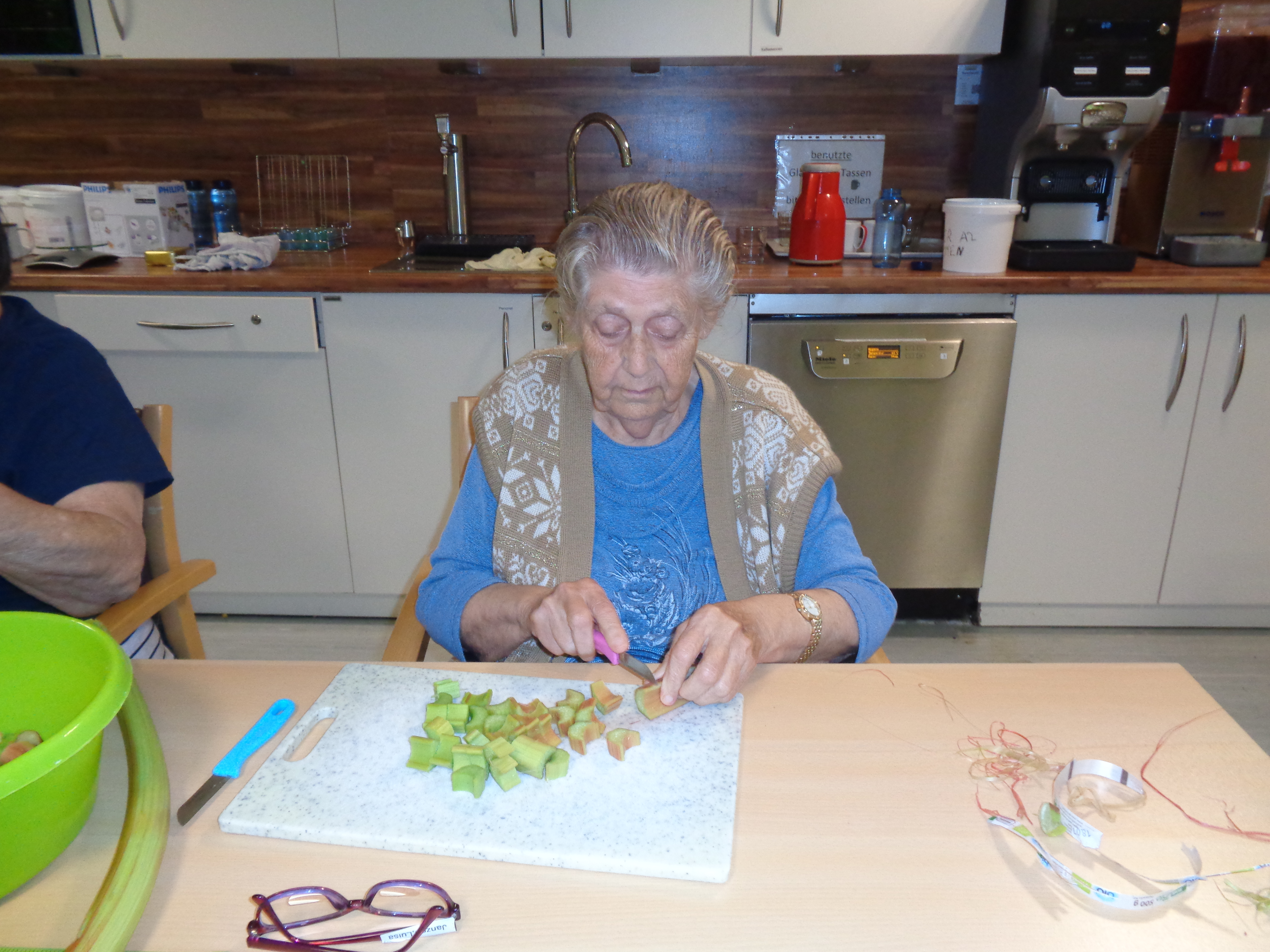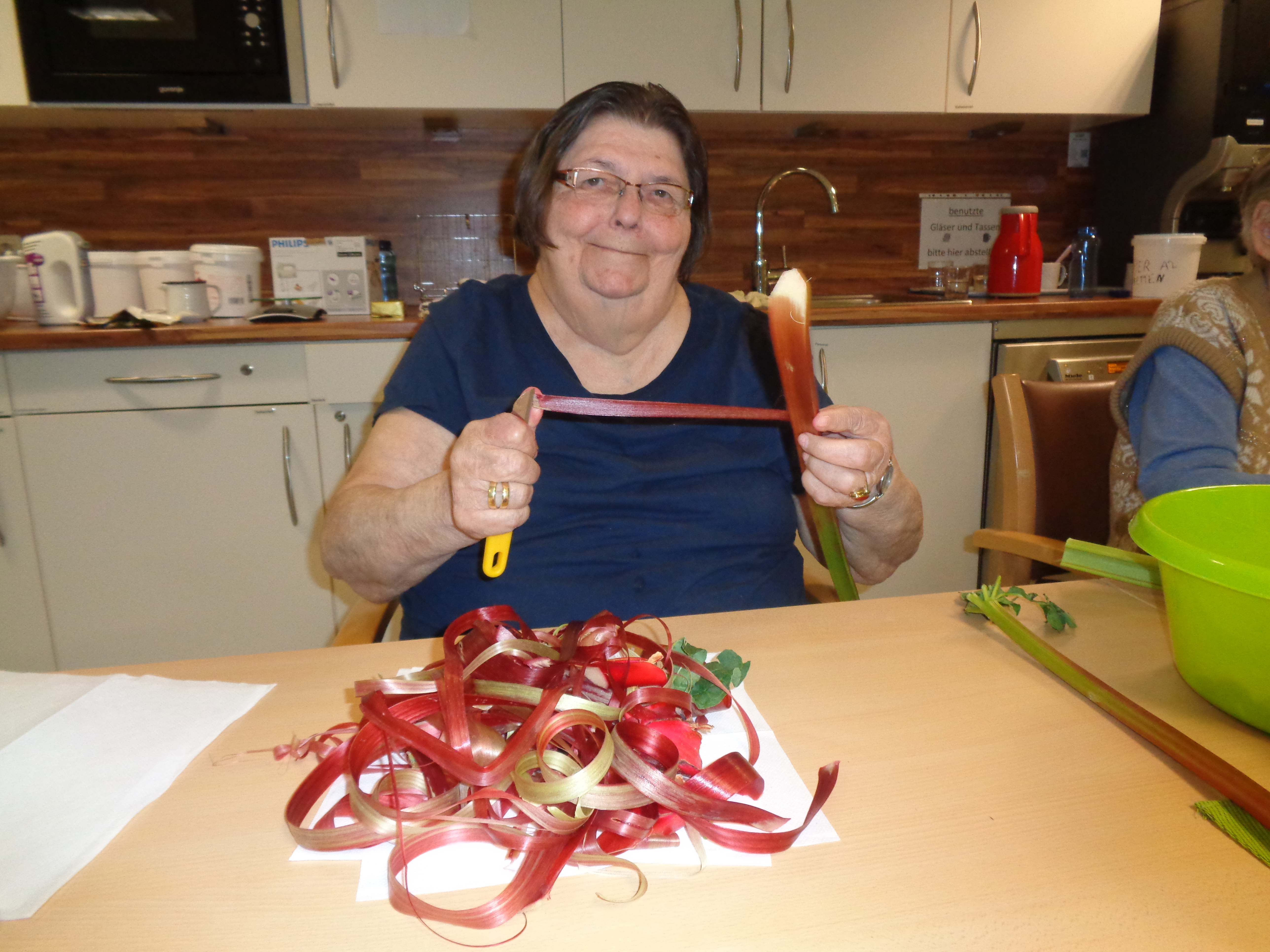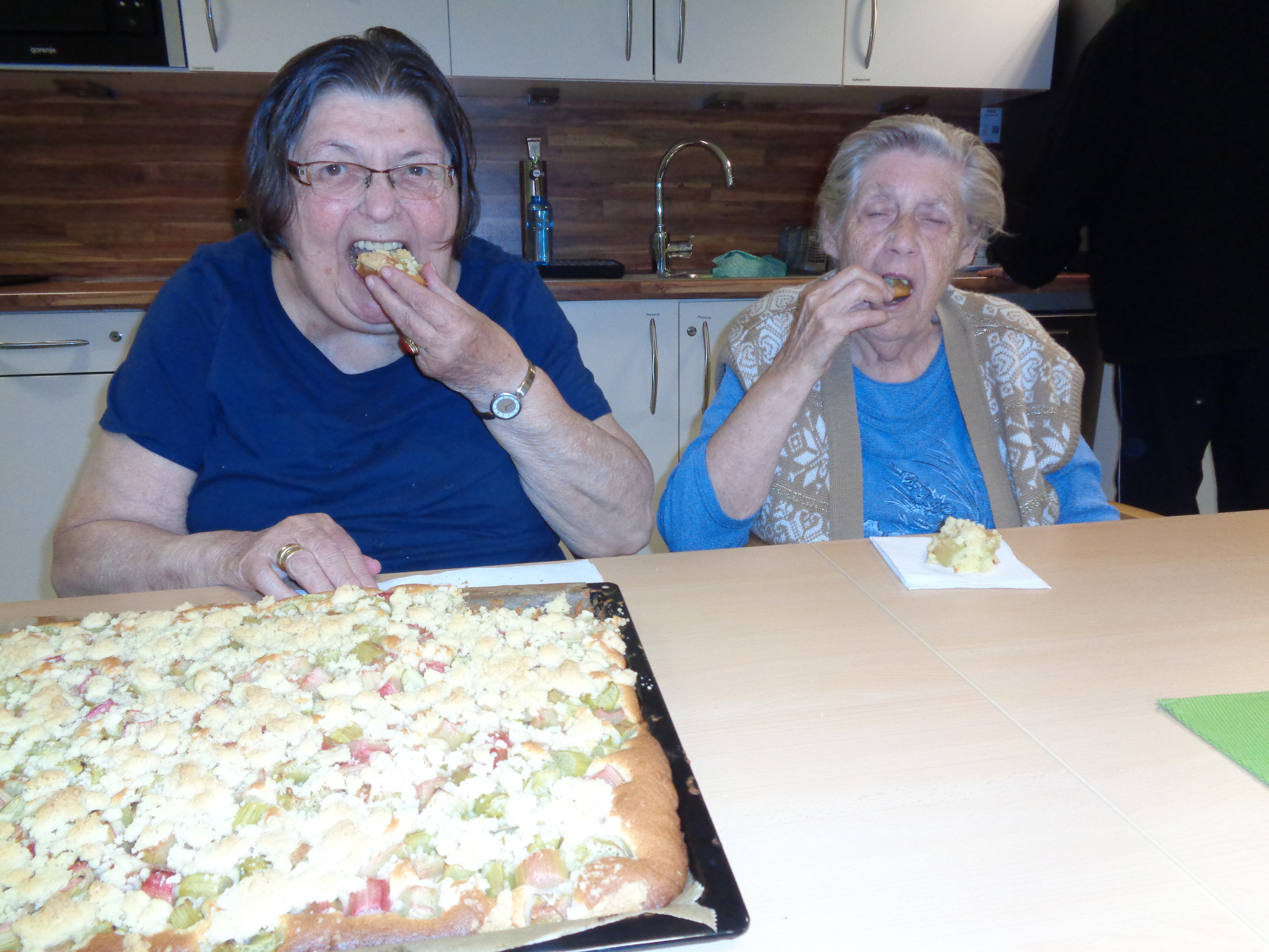 Unterstützt von einer Mitarbeiterin der Sozialen Betreuung wurde im Wohnbereich A2 leckerer Rhabarberkuchen gebacken. Wie ma sieht, hat der Kuchen sehr gut geschmeckt.