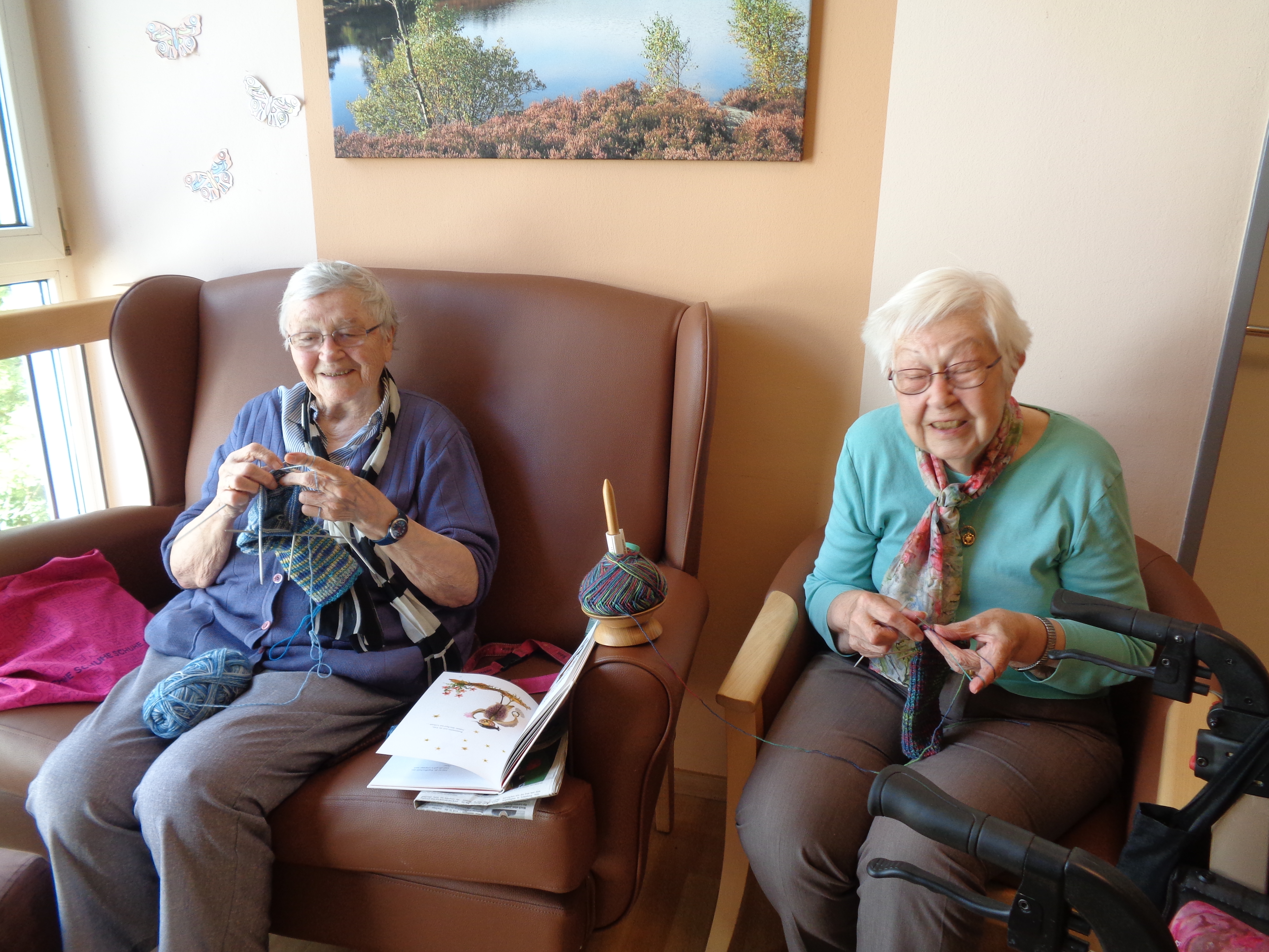 Viele unserer Seniorinnen und Senioren gestalten ihre Freizeit selbst. Es finden sich immer wieder Gruppen, die die gleichen Hobbys haben und sich dazu verabreden. Dabei gibt es vielerlei, was gemacht wird: Stricken, Lesen, sich unterhalten, Mundharmonika spielen, gemeinsam die Zeitschrift "Landlust" anschauen oder einfach beobachten, was sich im Wirtschaftshof so tut.