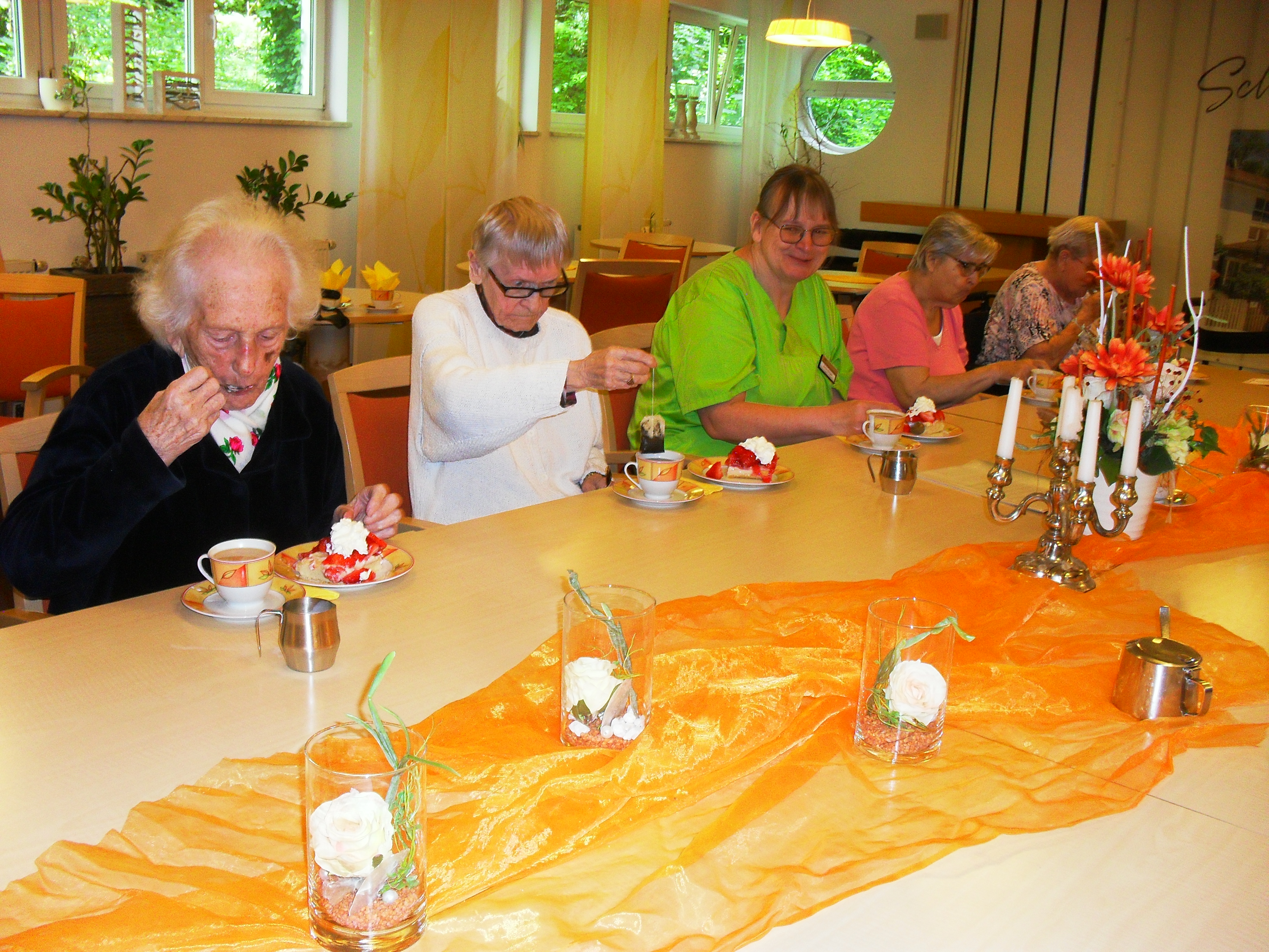 Wenn man die Lebensjahre aller Bewohnerinnen und Bewohner zusammenzählt, die beim Geburtstagskaffee am 12.06.2024 gemeinsam gefeiert haben, kommt man auf die stolze Summe von 1029 Jahren! Die Jubilare, die alle im April und Mai Geburtstag hatten, feierten bei Erdbeerkuchen mit Sahne und Kaffee. Dabei ist die älteste 95 Jahre alt geworden und die jüngste 67.