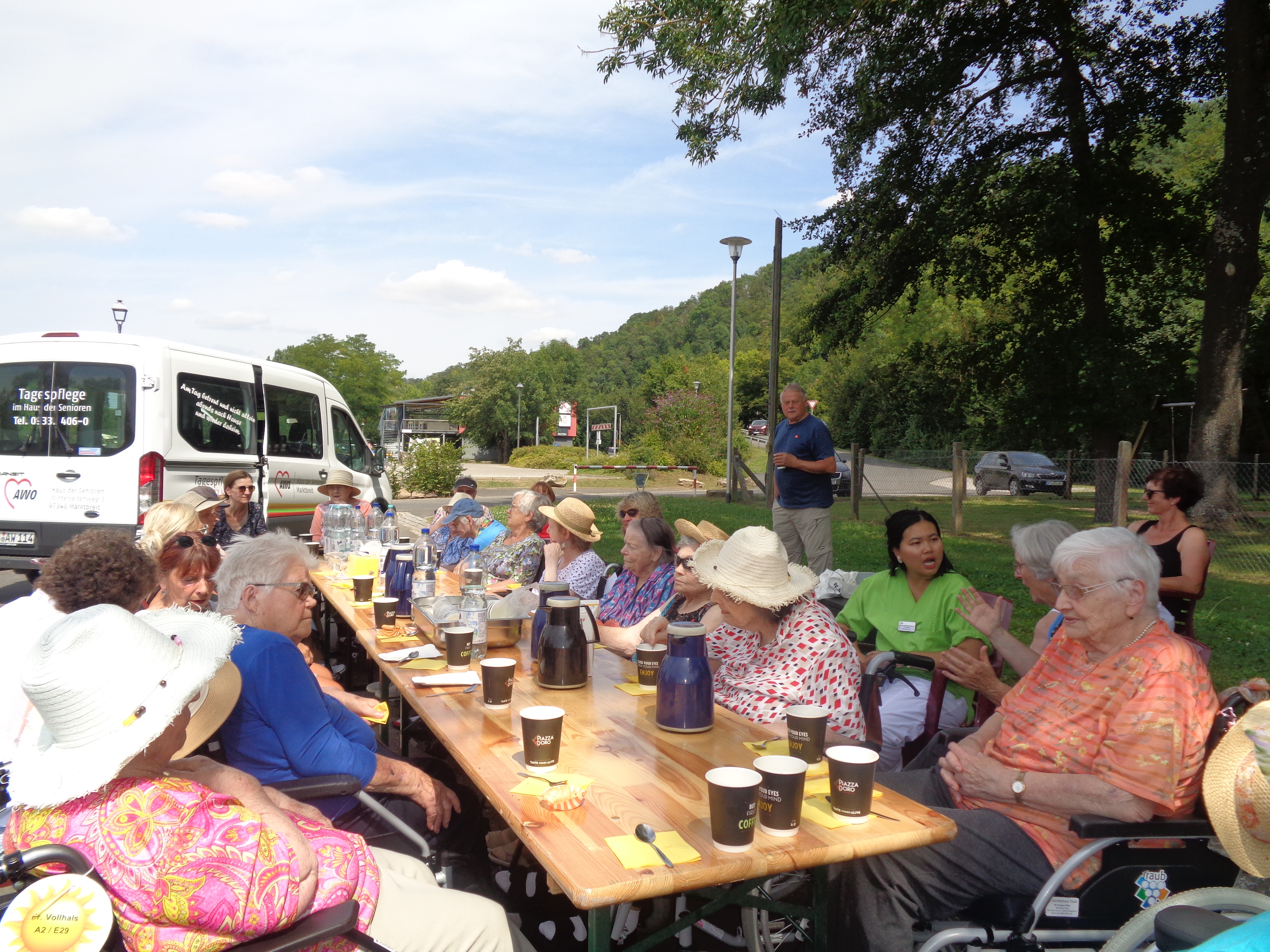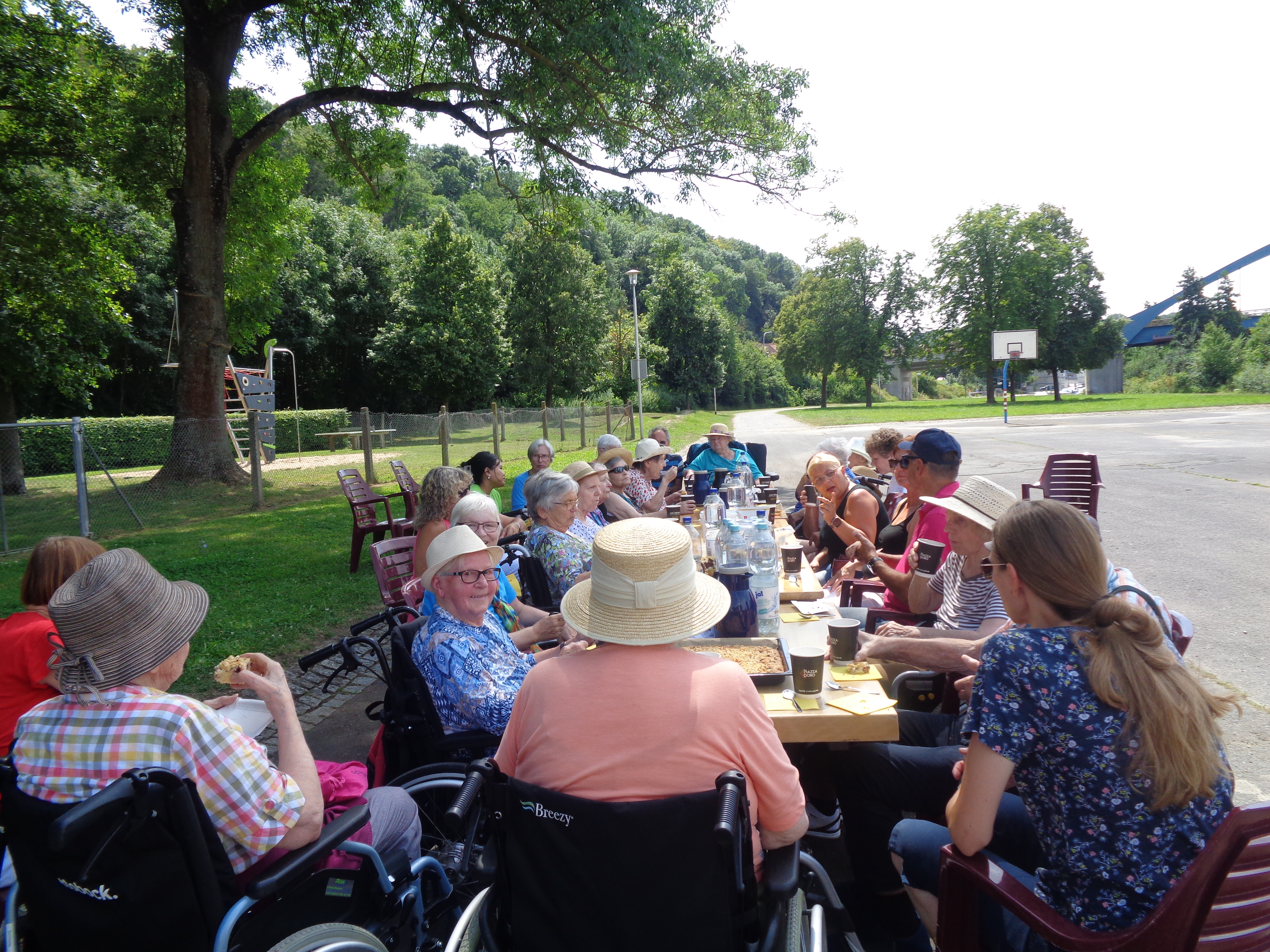Am 25.07.2024 fand der mittlerweile traditionelle Rollstuhlausflug statt. Mit der Unterstützung durch einige Angehörige und durch unseren Fahrdienst der Tagespflege wurden die Bewohnerinnen und Bewohner an den ehemaligen Rollschuhplatz hier in Marktbreit direkt am Main gebracht. Dort gab es ein kleines Picknick, viel Zeit für nette Unterhaltung und jede Menge Spaß. Der Ausflug wurde wie gewohnt vom Team der Sozialen Betreuung hervorragend vorbereitet und durchgeführt.
