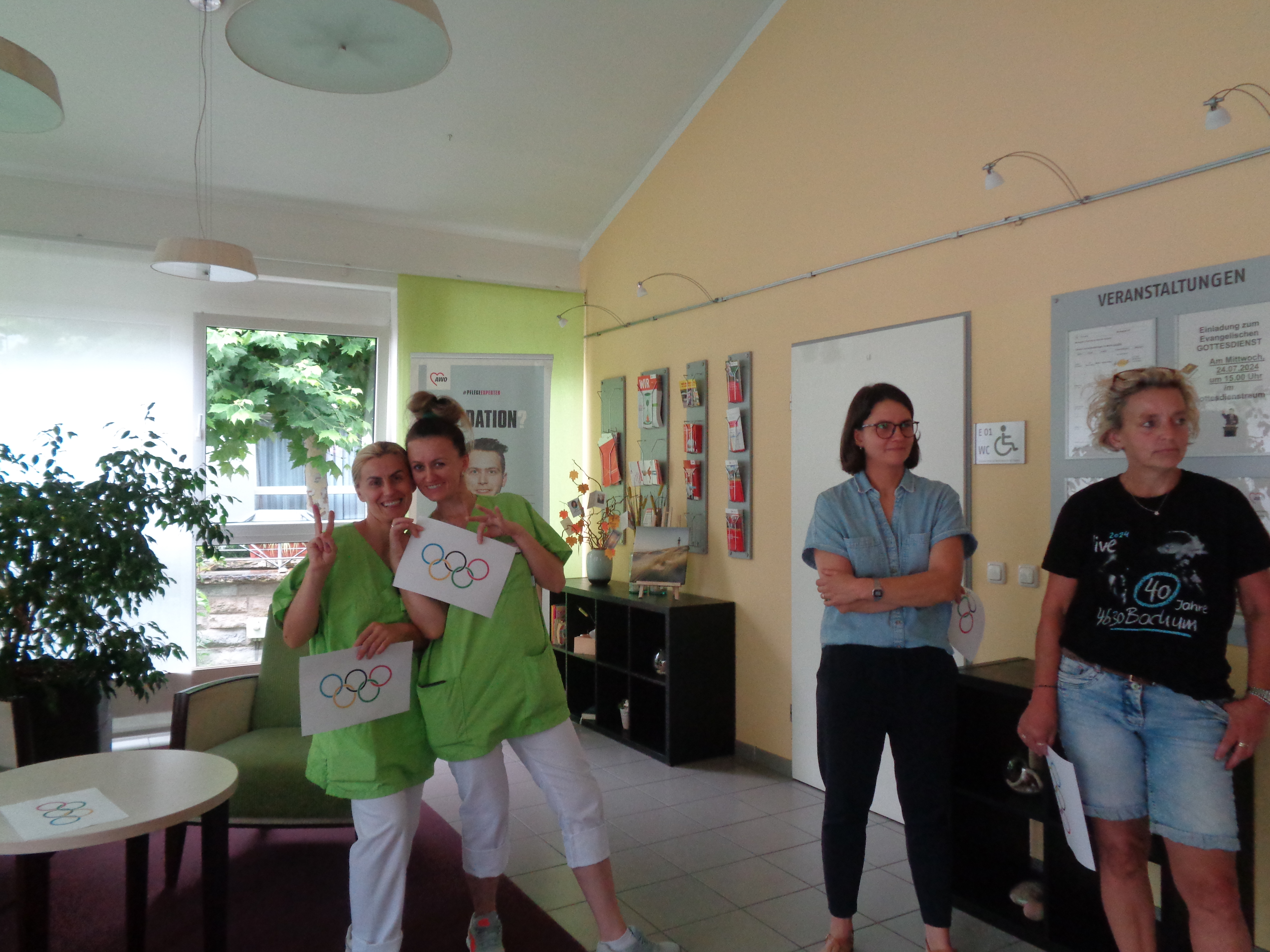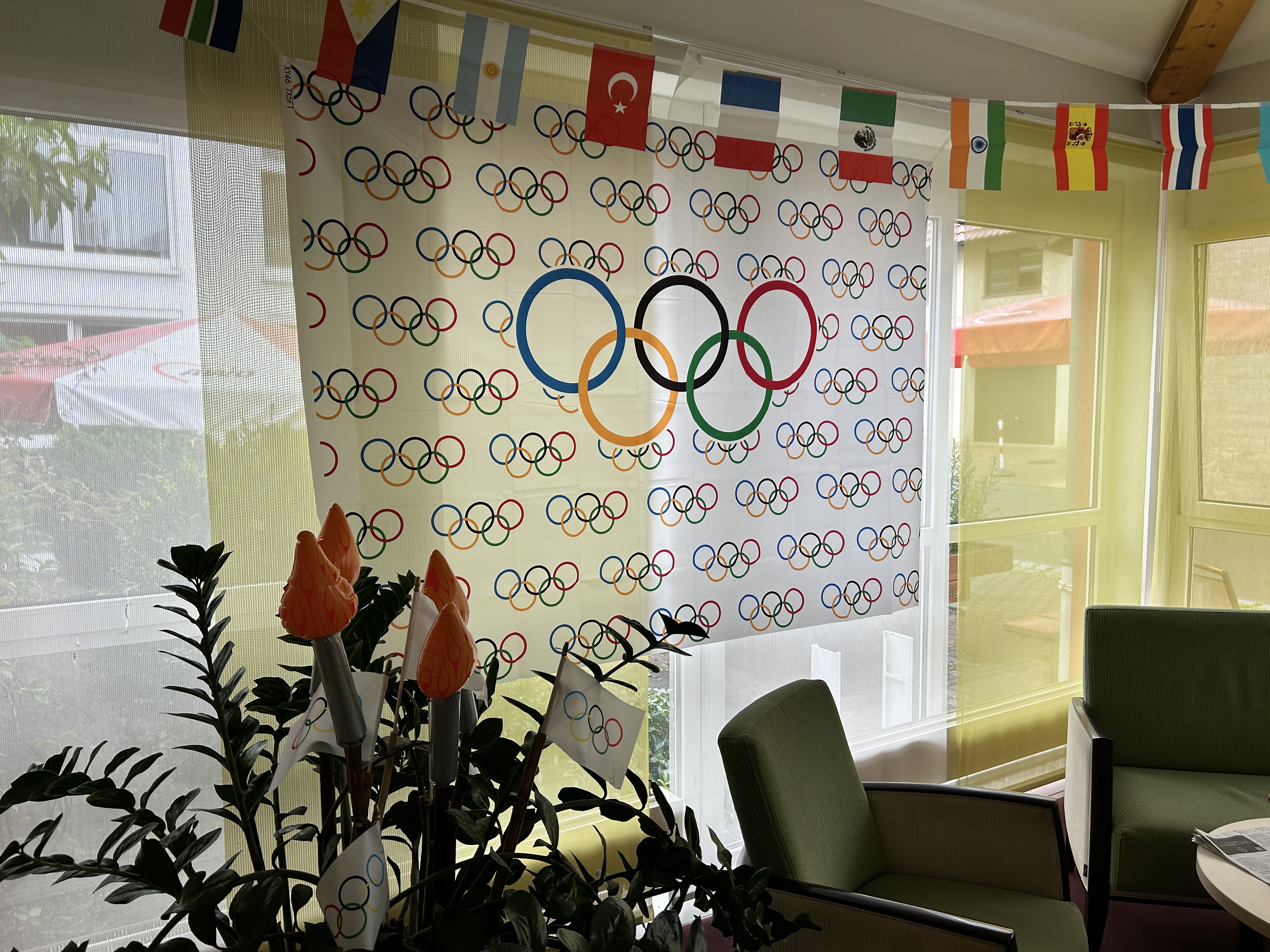 Es waren alle Kolleg*innen hierzu eingeladen. Einrichtungsleiter Herr Schuhmann eröffnete mit Fragen und Rätsel rund um Olympia. Um weitere Topleistungen auch während der Spiele abrufen zu können, wurden symbolisch als Geste Power-Müsliriegel verteilt. Unsere Themenecke wird je nach öffentlichem Anlass, Großereignissen wie Olympia, Fußballeuropameisterschaft etc. immer individuell gestaltet und auch von den Bewohner*innen rege genutzt.