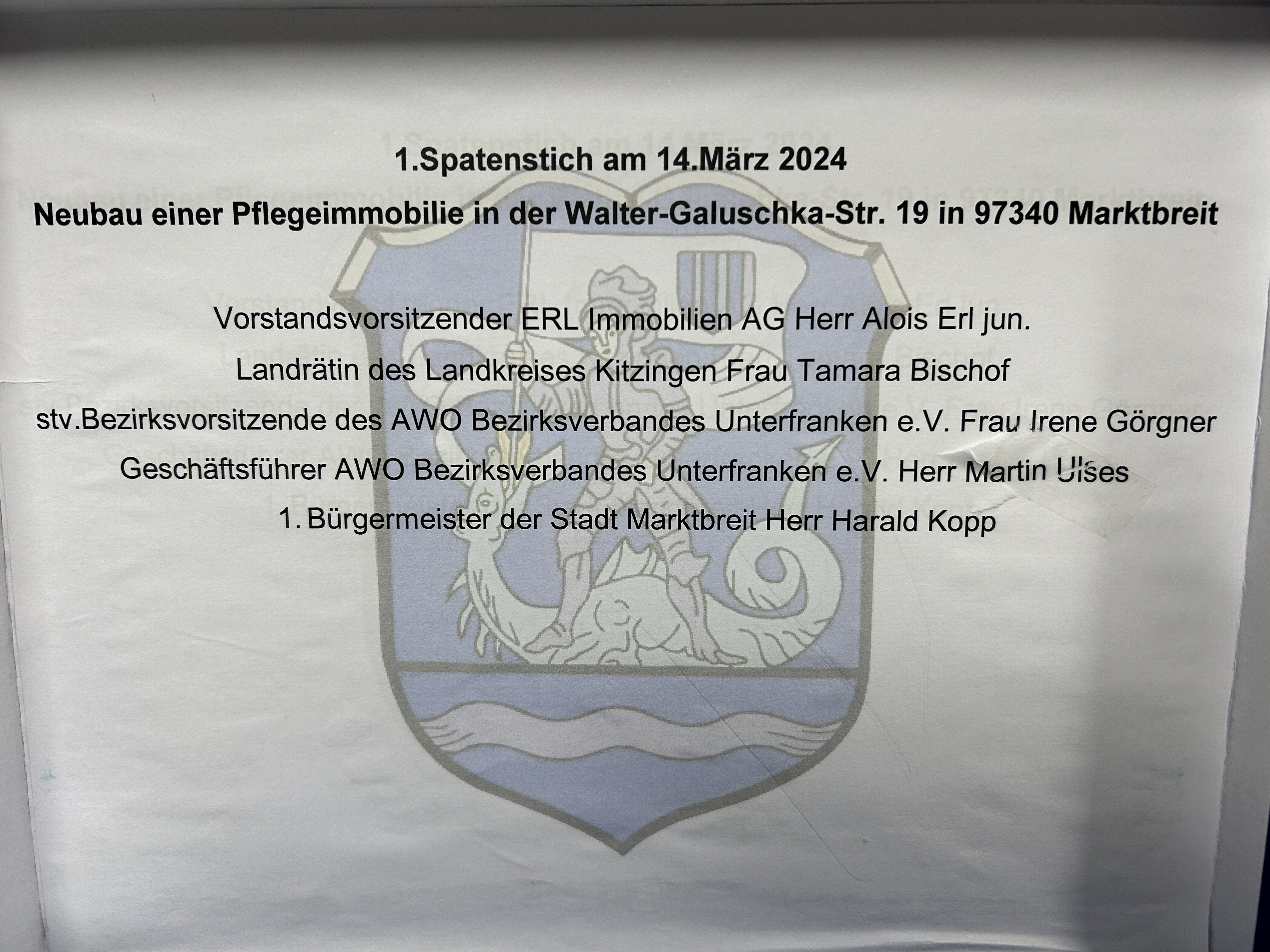 Endlich war es so weit, der Beginn des Neubaus am Ohrenberg, genauer gesagt in der Walter-Galuschka-Straße 19, ist gestartet. Mit dem Spatenstich wurde der Baubeginn symbolisch gefeiert. Sogar das Fernsehen war, den Beitrag von TV Mainfranken finden Sie unter https://www.tvmainfranken.de/mediathek/video/spatenstich-zum-neubau-des-pflegeheims-in-marktbreit-eroeffnung-voraussichtlich-herbst-2025/.