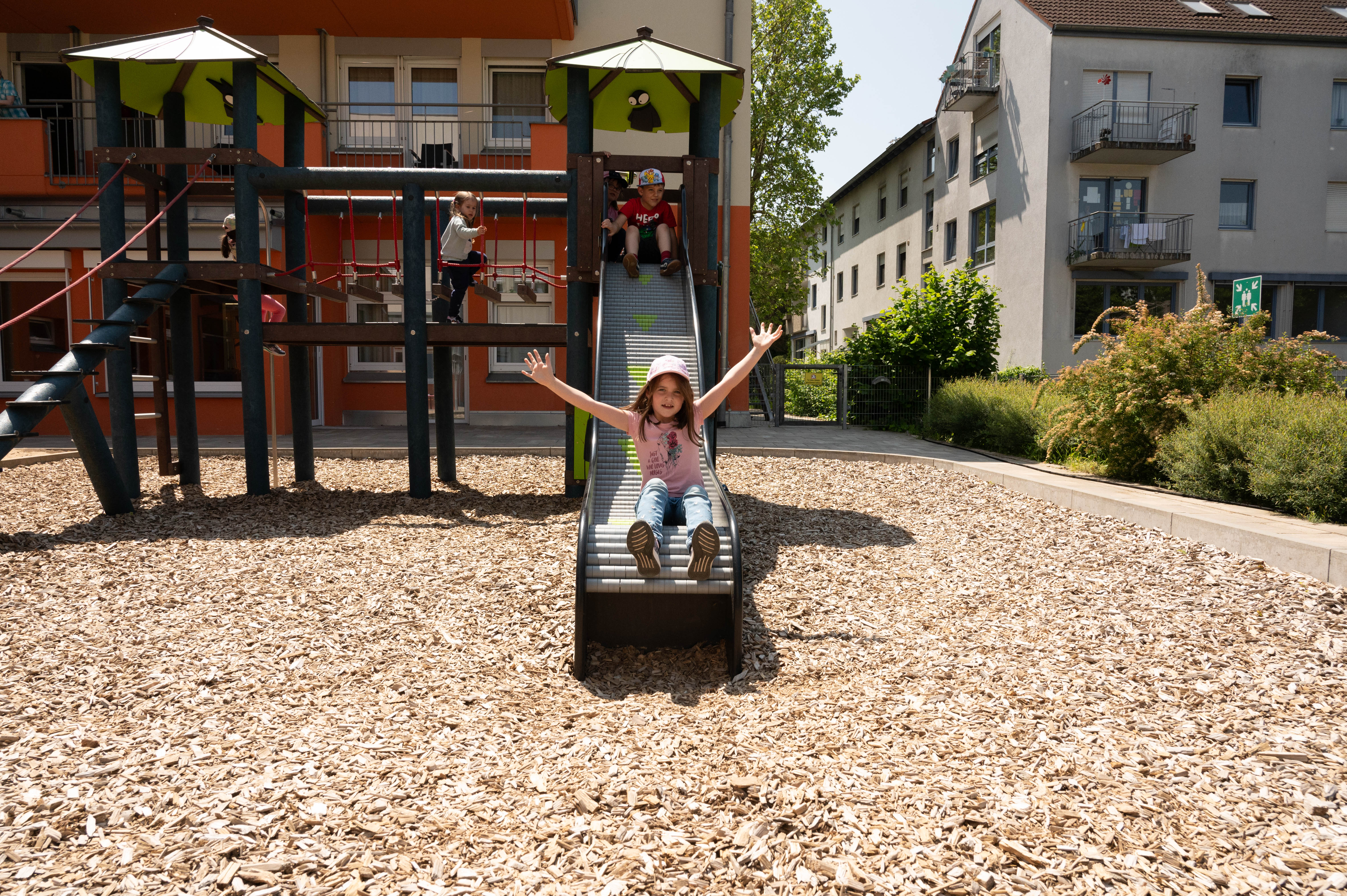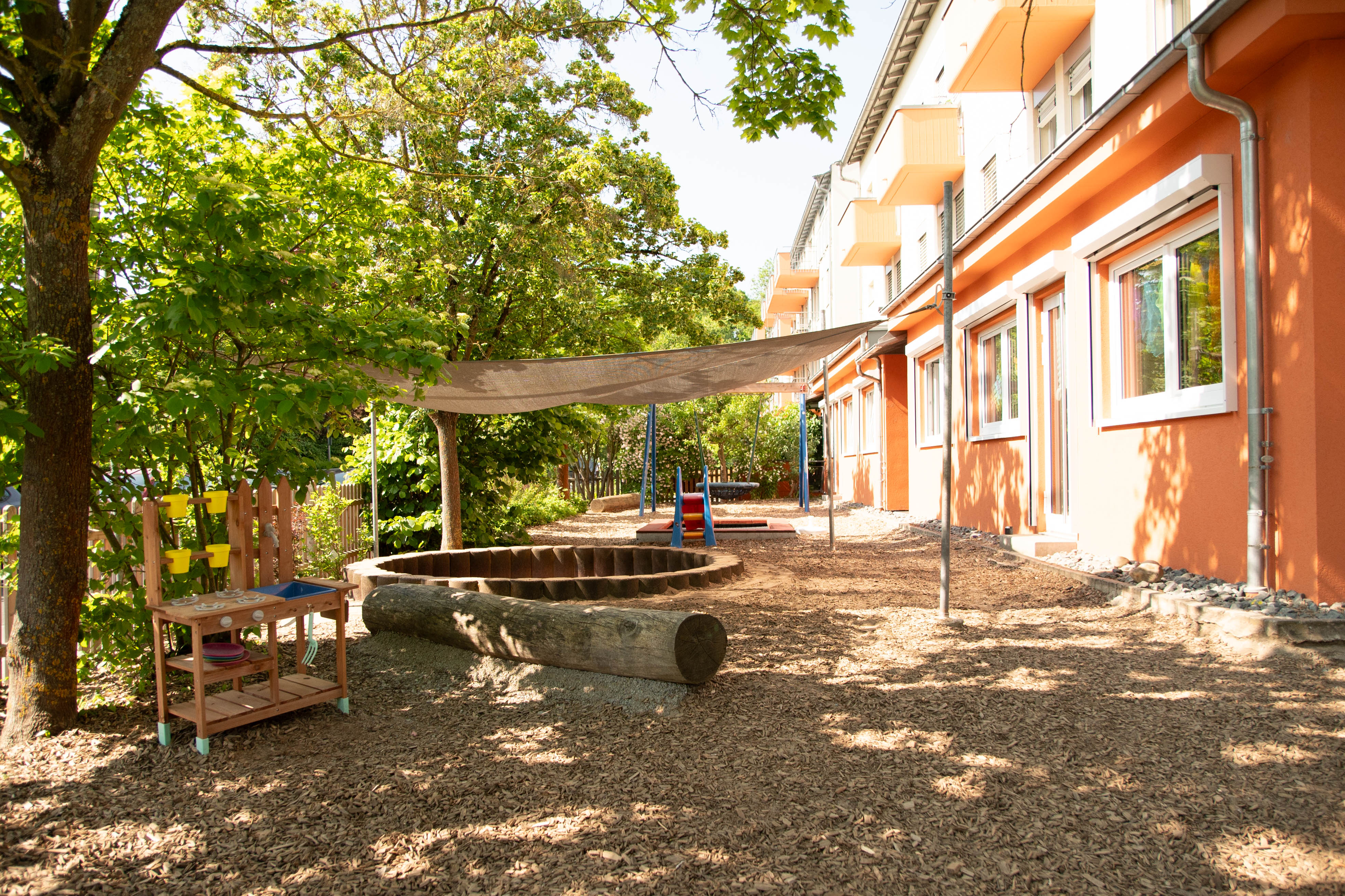 Unser Garten umrahmt das gesamte Gebäude und wurde 2020 dank großzügiger Förderung der GlücksSpirale neu saniert. Auf neuem Kletterturm mit Rutsche und weiteren Spielmöglichkeiten sowie am Wasserspielbereich können die Kinder nun ihrer Fantasie freien Lauf lassen und sich austoben. Weiterhin gibt es einen gesonderten Bereich für die Krippenkinder des Kinderhauses, in dem sich eine Minivariante des Spielplatzes befindet. Gemeinsam mit den Eltern hat man sich hierbei für eine neue Art der Spielgeräte aus wiederverwertbarem Plastik ohne Weichmacher entschieden, die besonders robust und langlebig sind. Im Sommer spenden Sonnensegel Schatten.