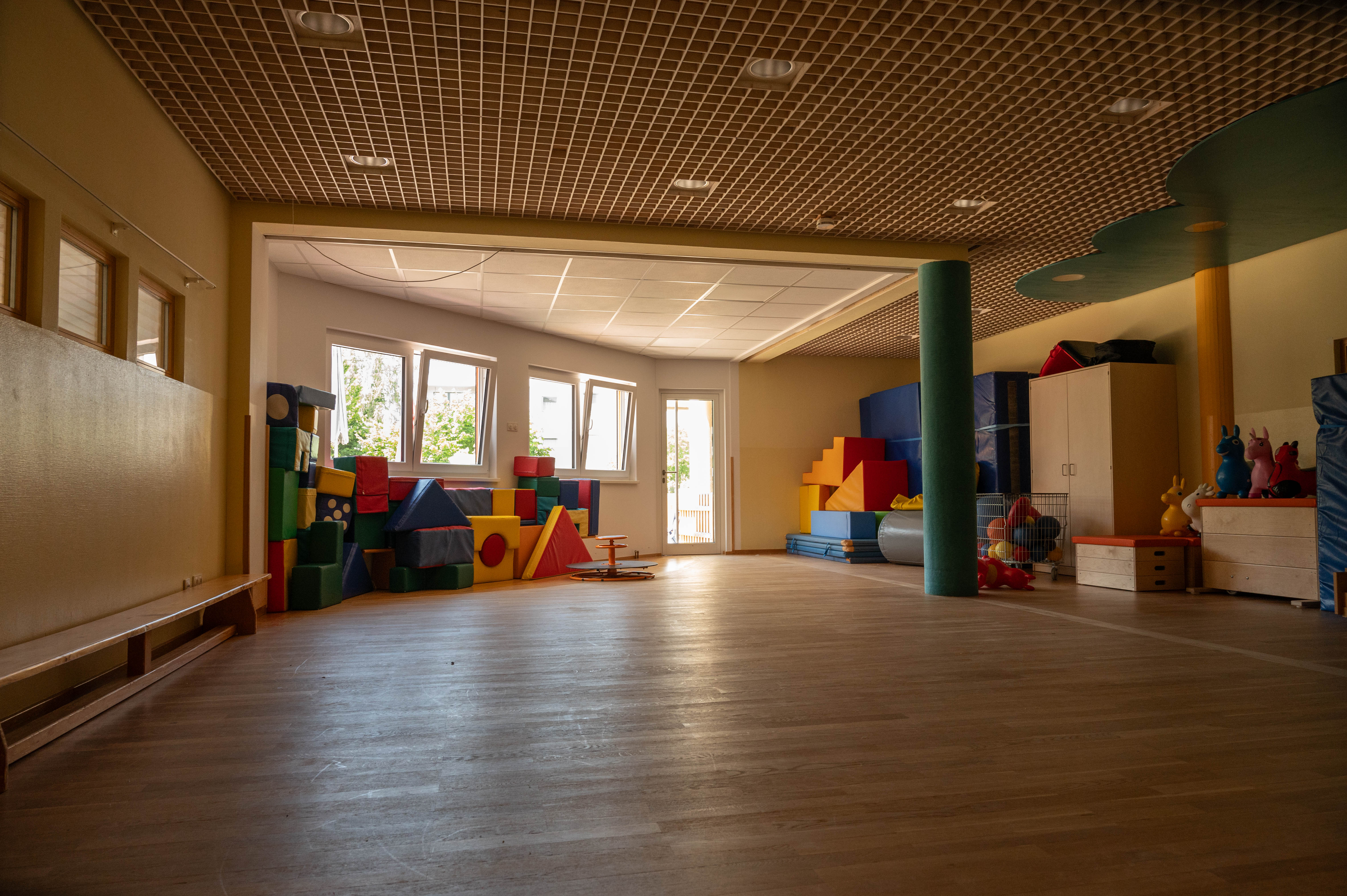 Die Kindergartenräume sind großzügig mit Nebenzimmern und zweiten Spielebenen gestaltet und durch die große Fensterfront sehr lichtdurchflutet.