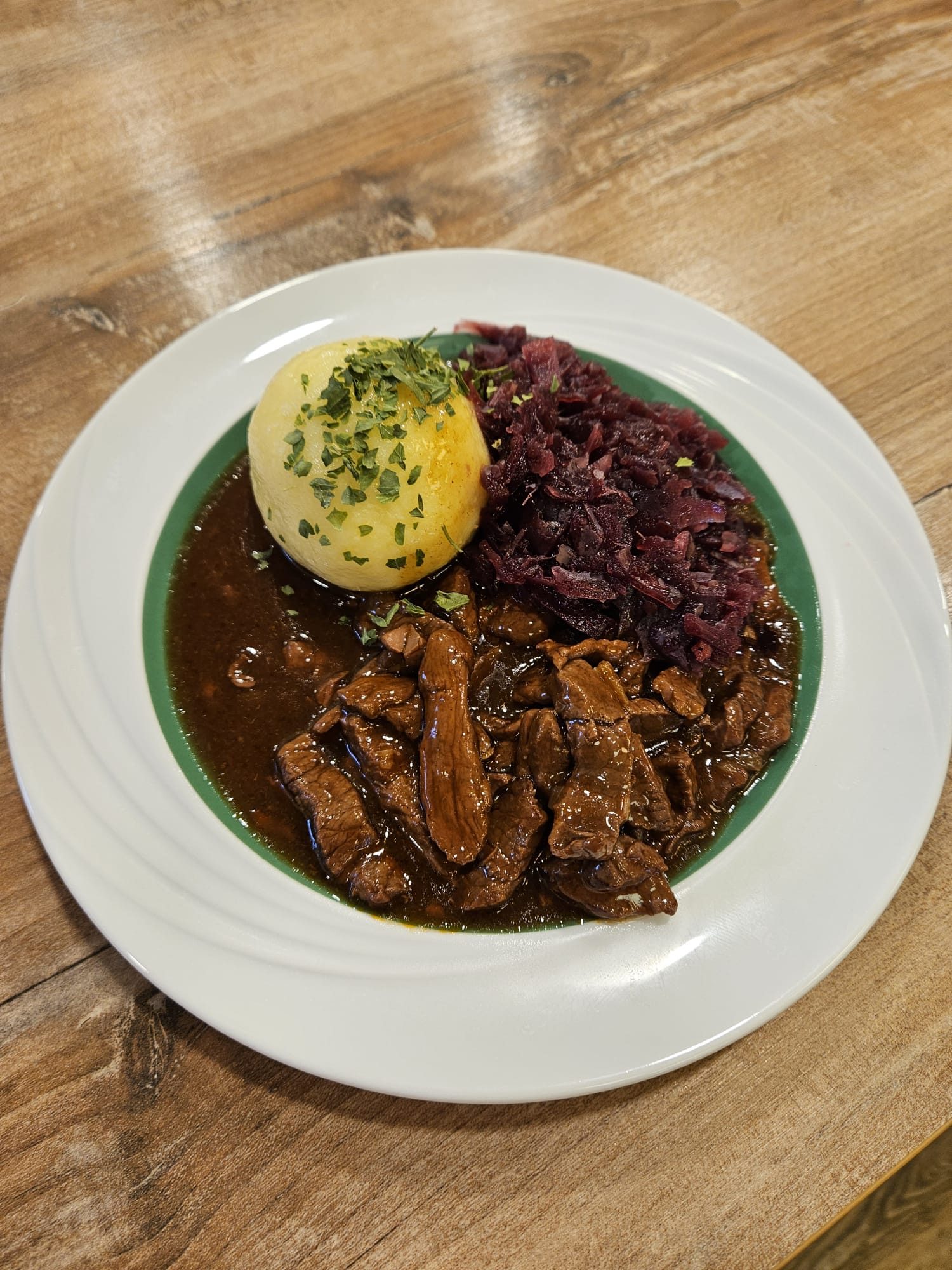 Für das leibliche Wohl war ebenfalls bestens gesorgt. Unser Hauswirtschaftliche Betriebsleiterin zauberte ein köstliches, hausgemachtes Mittagessen das aus einer feinen Hochzeitssuppe, zartem Burgunderbraten mit Blaukraut und Klößen bestand. Zum krönenden Abschluss gab es sowohl helles als auch dunkles Schokoladenmousse, das die Feier perfekt abrundete.