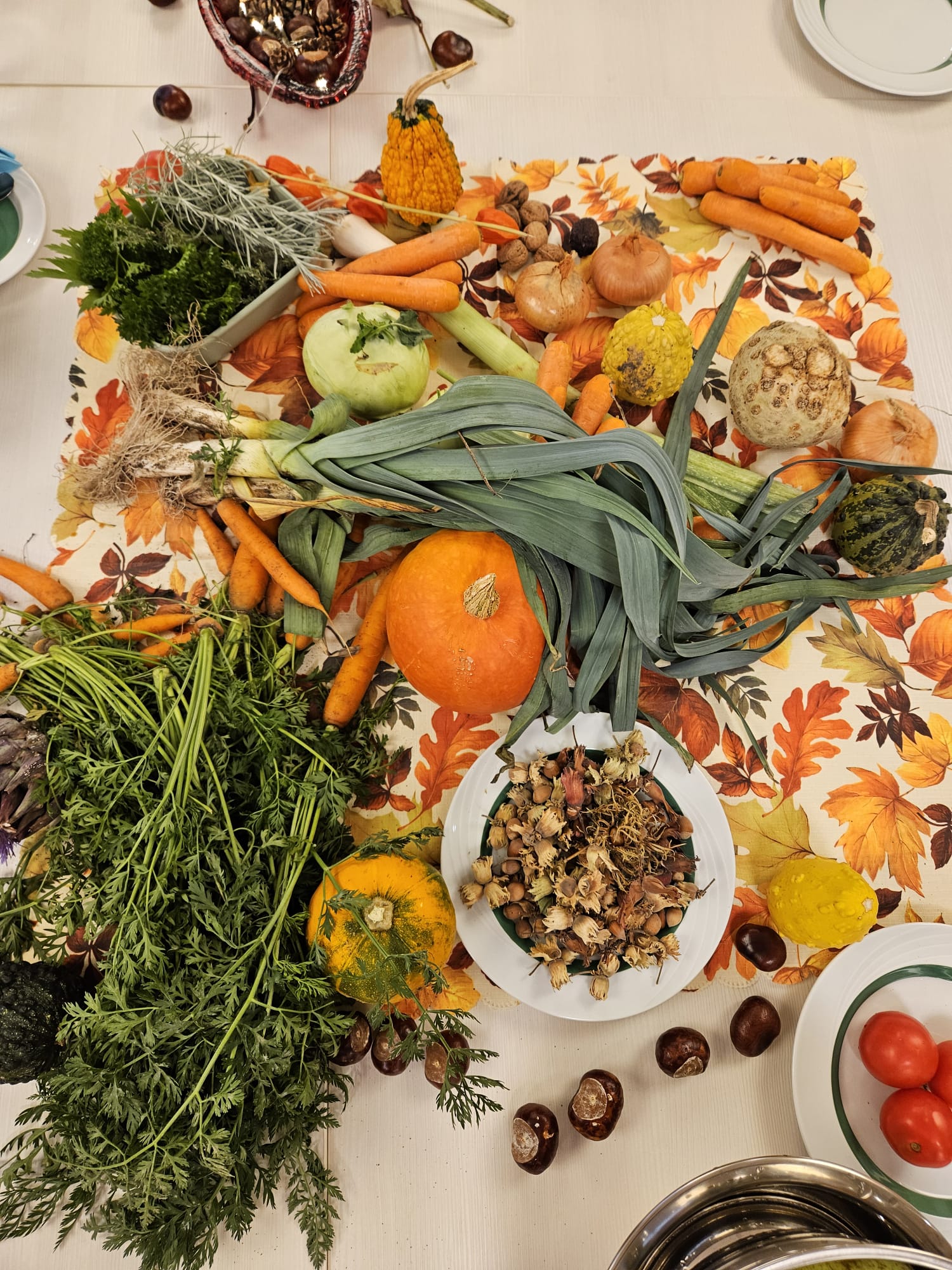 Gemeinsam schnippelten die Gäste Gemüse - Karotten, Kartoffeln, Zwiebeln und Sellerie wurden mit viel Geschick und Freude in kleine Stücke geschnitten. Dabei wurden Geschichten aus der eigenen Erntezeit erzählt, und es wurde viel gelacht. Die Erinnerungen an die eigene Kindheit und die Erntefeste, die man früher gefeiert hatte, wurden lebendig und schufen eine herzliche Atmosphäre.