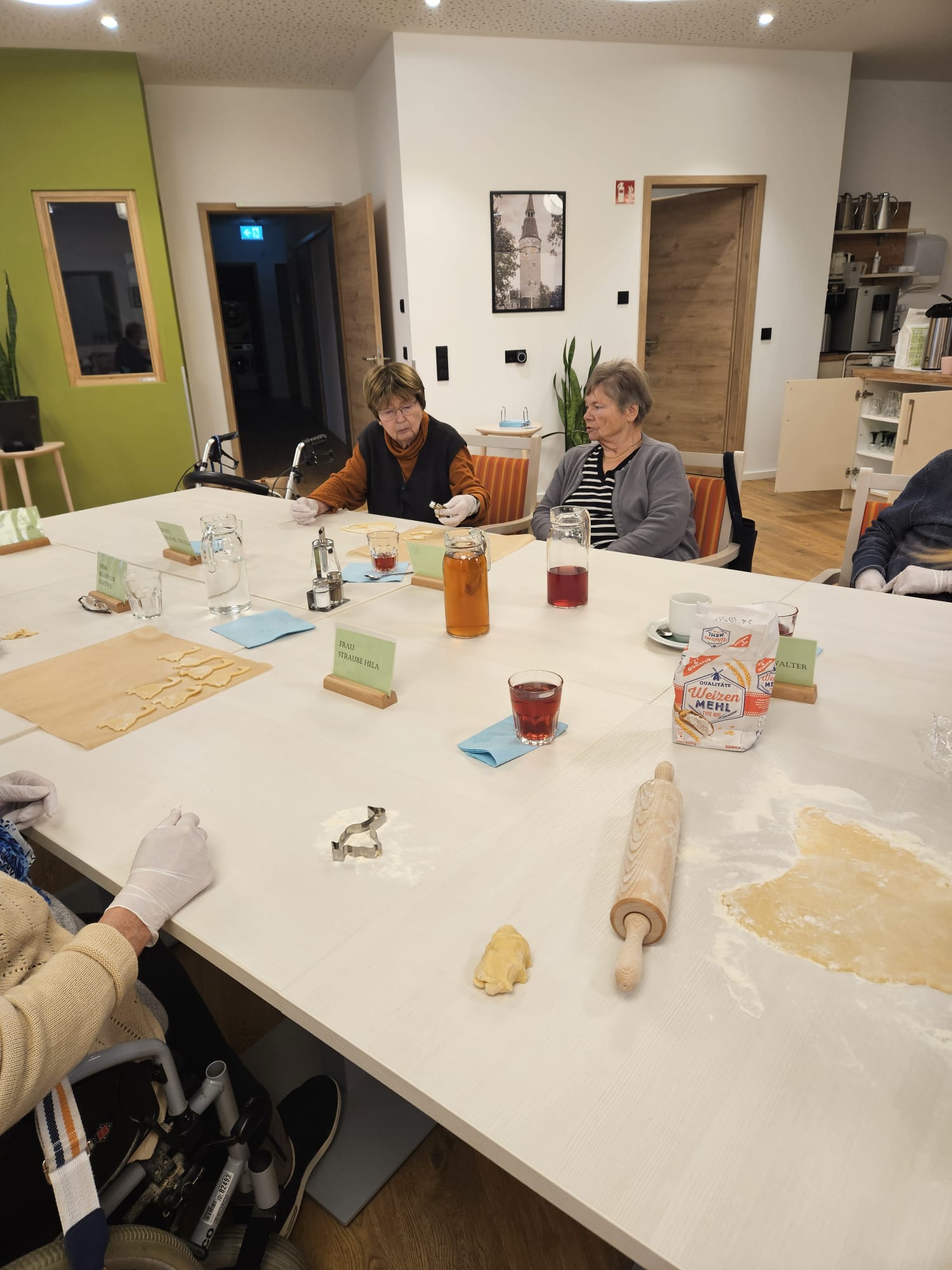 In der Tagespflege wird auch fleißig gebacken! Der süße Duft von frisch gebackenem Lebkuchen erfüllt den Raum und weckt Erinnerungen an vergangene Weihnachten. Es wird gesungen, gelacht und die Vorfreude auf das gemeinsame Naschen der Leckereien wächst.