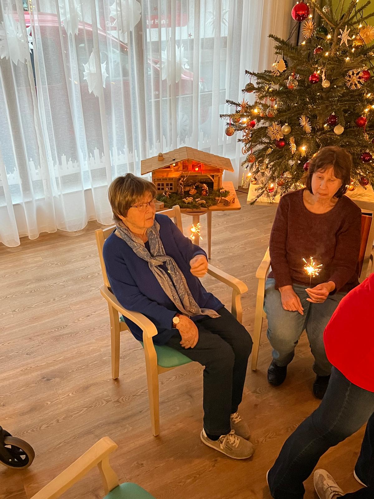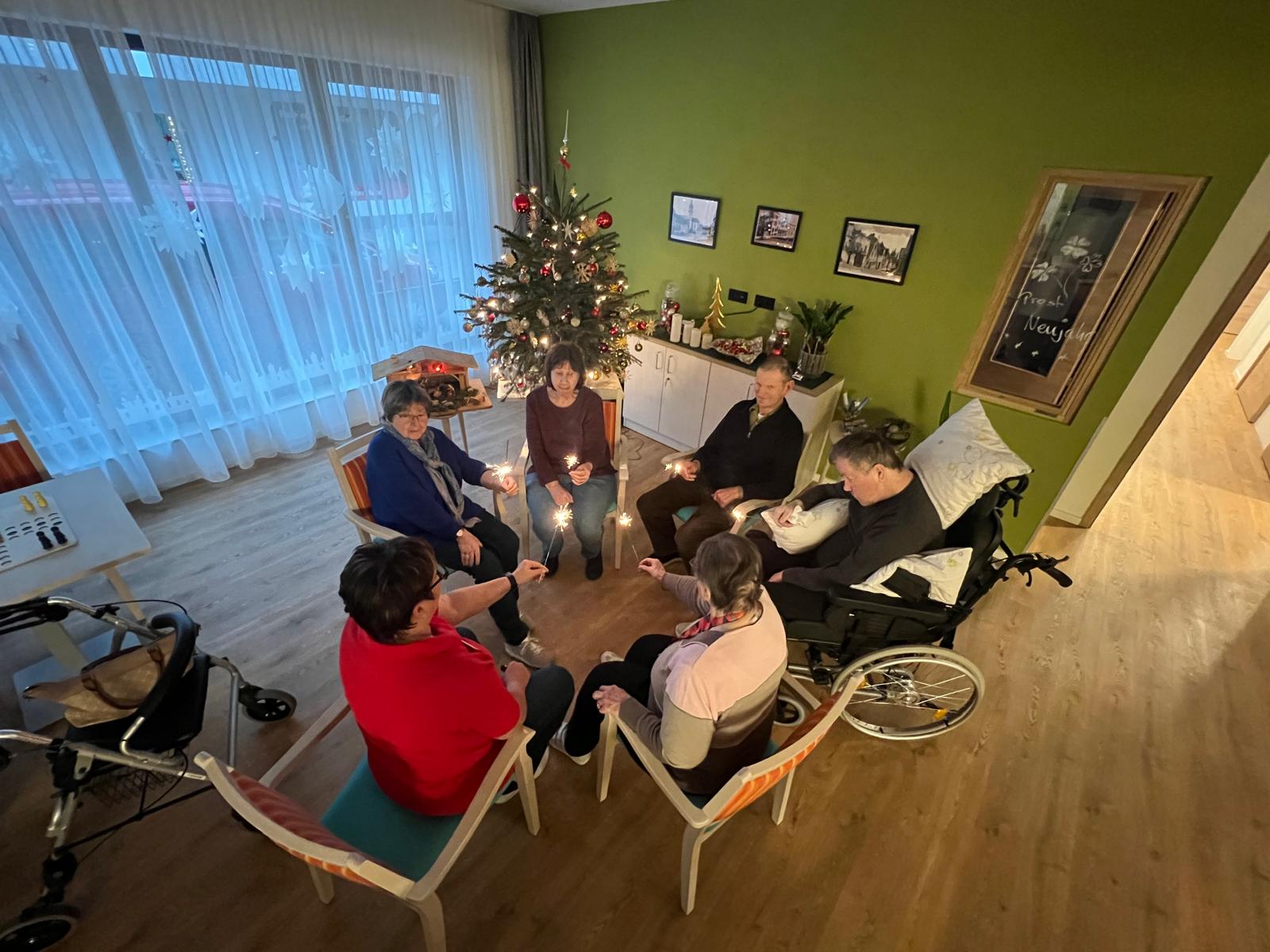 Unsere lieben Tagespflegegäste versammeln sich in festlicher Stimmung, um gemeinsam den Jahreswechsel zu feiern. Mit strahlenden Augen und einem Lächeln auf den Lippen halten sie die Wunderkerzen in der Hand.