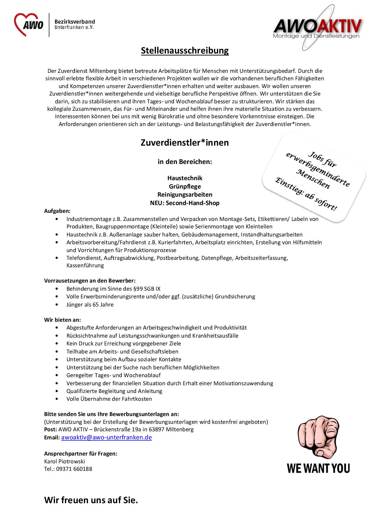 Ansprechpartner für Fragen: Karol Piotrowski Tel.: 09371 660188