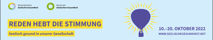 Unter dem Motto „Reden hebt die Stimmung – Seelisch gesund in unserer Gesellschaft” setzt sich die Woche der Seelischen Gesundheit, die vom 10. bis 20. Oktober 2022 bundesweit stattfindet, dafür ein, in Krisenzeiten miteinander ins Gespräch zu kommen und Verständnis füreinander zu entwickeln. Denn: Reden hilft und kann entstandene Gräben überwinden und zu einem neuen Miteinander beitragen.